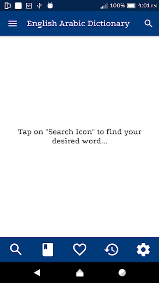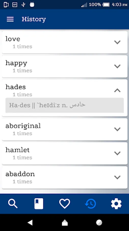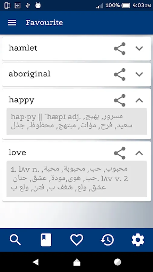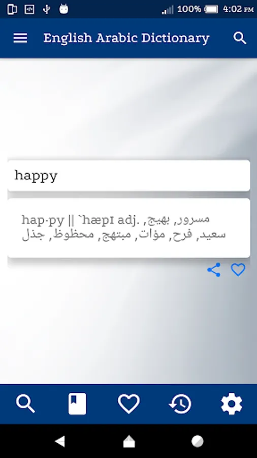 * Listen to the correct pronunciation in British or American English and Arabic (if installed) using Android's built-in Text-to-speech synthesizer