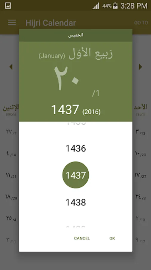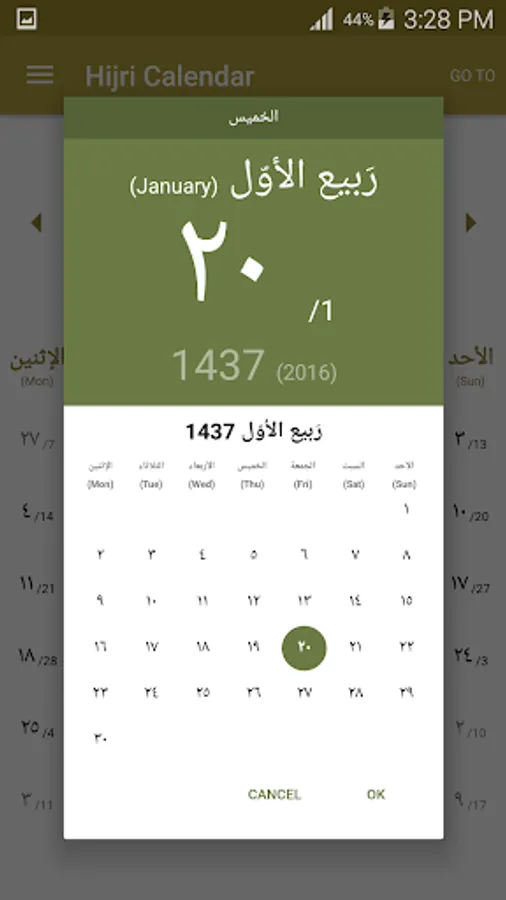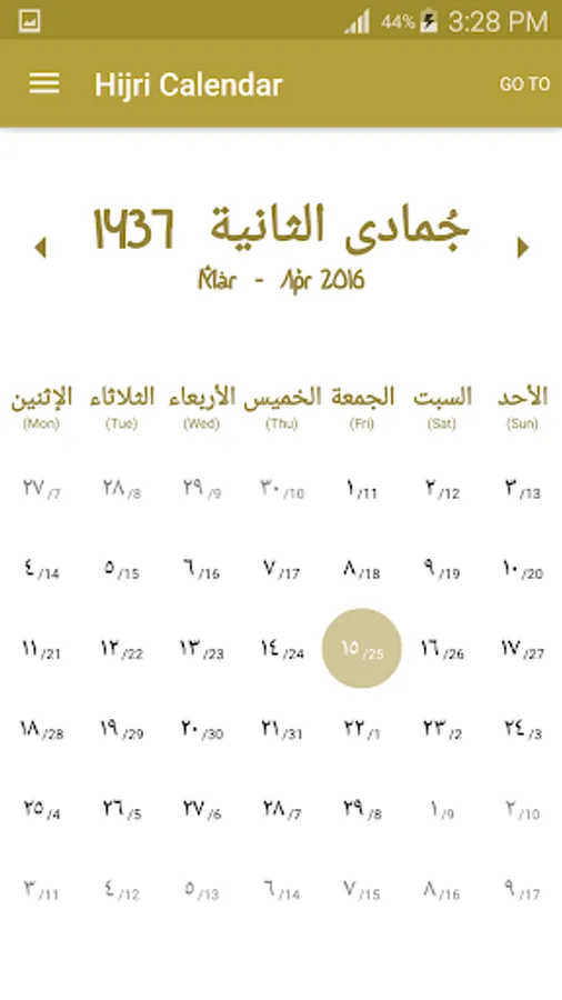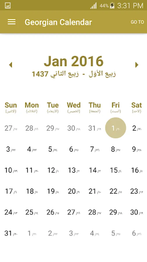 1: "Go to today" will select today's date of Hijri/Georgian (Selected) Calendar
