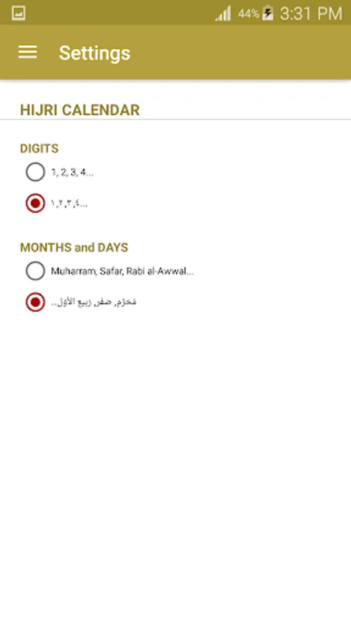 4: Settings will help you select English/Arabic digits for Hijri Calendar as well as Hijri Month/Day names in English/Arabic