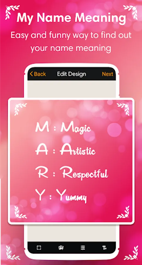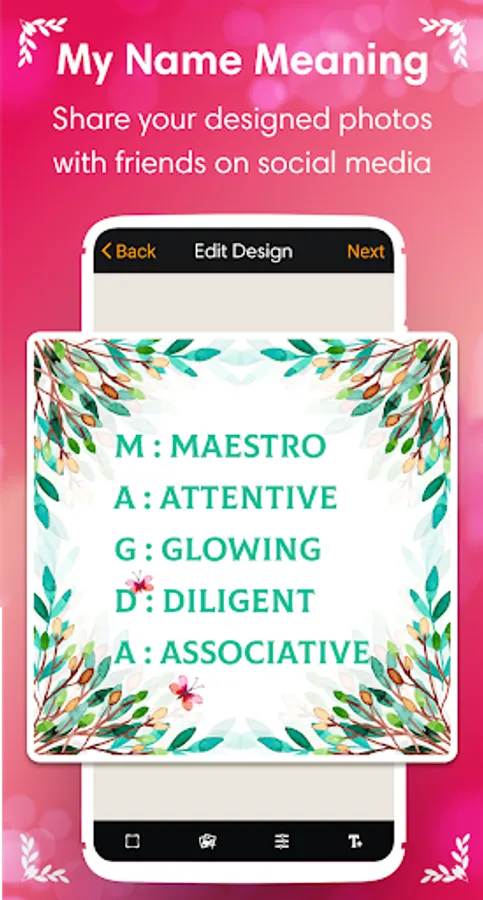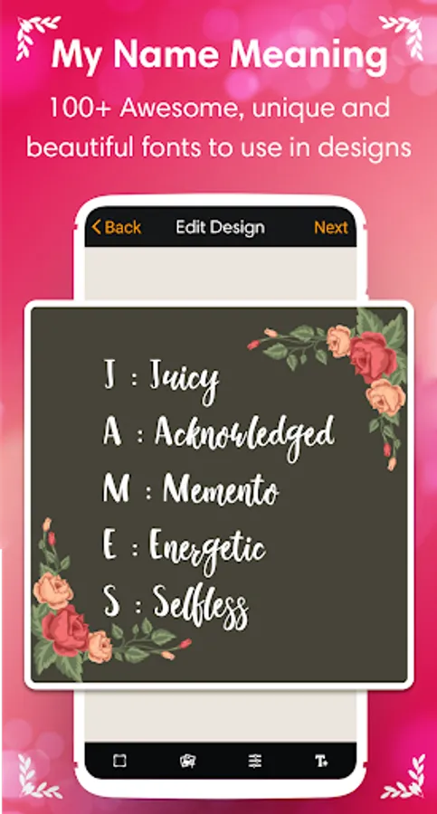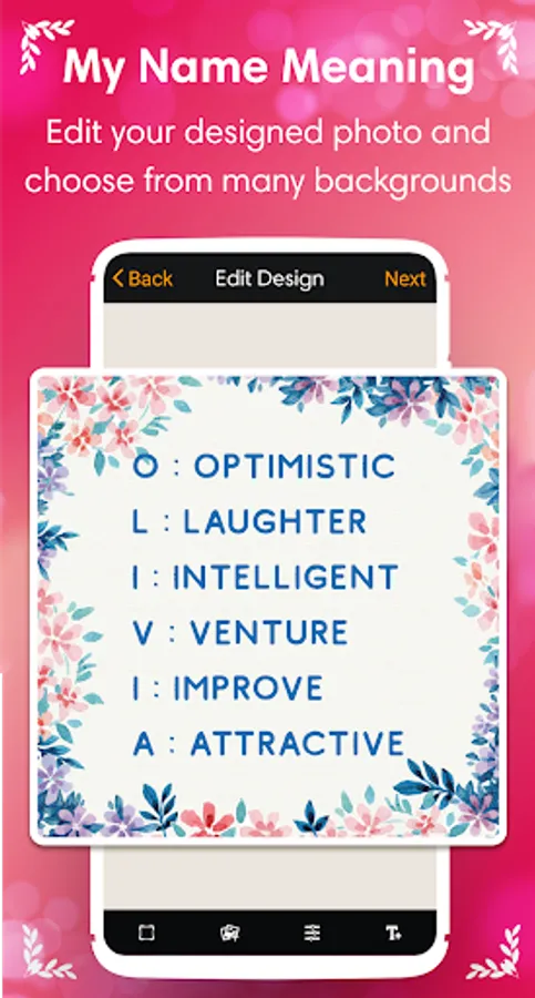 Generate a beautiful name meaning design and share it with your friends or put it as your display picture or wallpaper, you can even print and frame it on your wall.