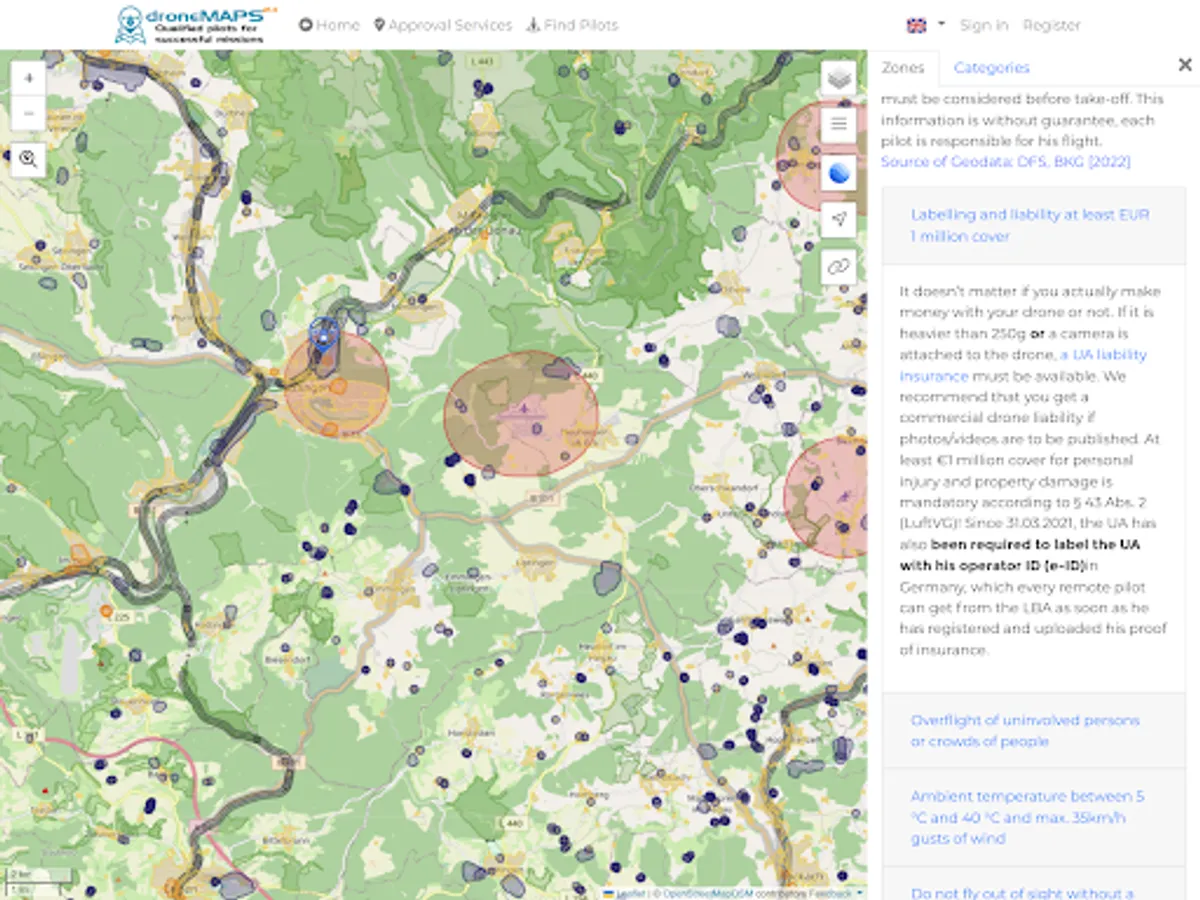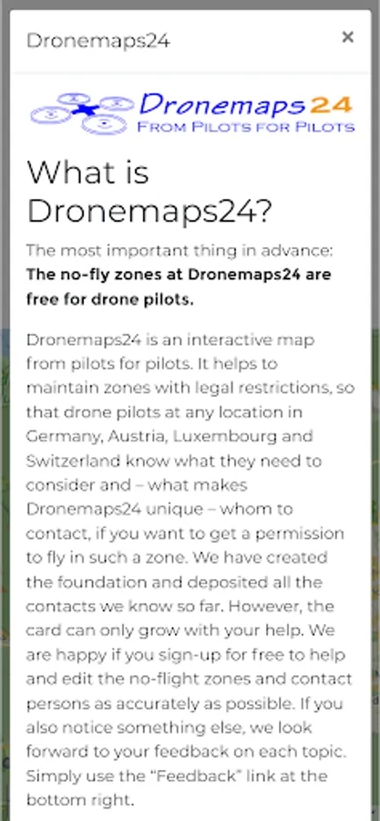 Dronemaps24 is an interactive map from pilots for pilots. It helps to maintain zones with legal restrictions, so that drone pilots at any location in Germany, Austria, Luxembourg and Switzerland know what they need to consider and – what makes Dronemaps24 unique – whom to contact, if you want to get a permission to fly in such a zone. We have created the foundation and deposited all the contacts we know so far. However, the card can only grow with your help. We are happy if you sign-up for free to help and edit the no-flight zones and contact persons as accurately as possible. If you also notice something else, we look forward to your feedback on each topic. Simply use the “Feedback” link at the bottom right.