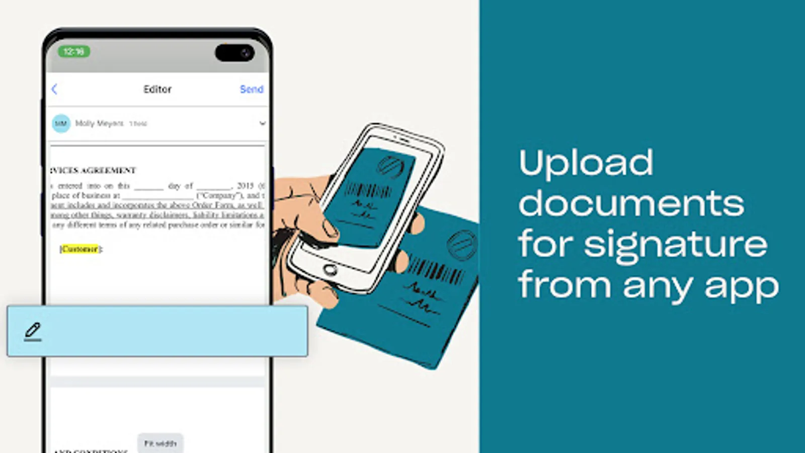 The PDF filler, document editor, and electronic document signer let you easily edit your PDF files or upload images and documents, then quickly send and sign a legally-binding electronic signature from the palm of your hand.