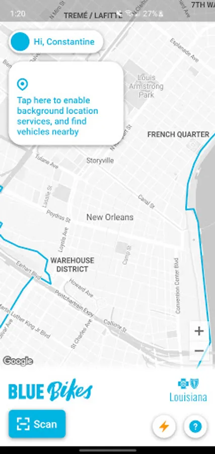 The Blue Bikes Nola App also shows a map of neighborhoods in our service area. These neighborhoods include the French Quarter, Tremé, Central Business District (CBD), the Lower Garden District, Central City, the Marigny, Bywater, Mid-City, and Bayou St. John.