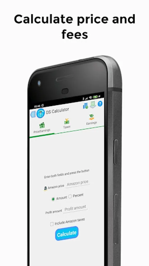 1) eBay price calculator - you have your Amazon price(your dropshipping supplier) and you know what amount of money or percentage of Amazon price you want to earn but you cannot calculate your eBay price. In this situation you should use the first screen of Dropshipping Calculator app - PriceEarnings.
