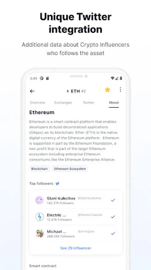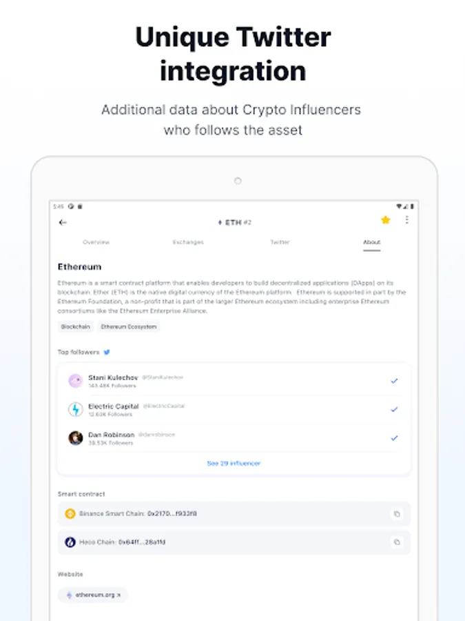 Whilst on the coin`s page you can see LIVE price of your selected coin with charts that can be altered by selecting other currency pairs. We`ve introduced the performance section to help you evaluate your coin`s score against other coins, blockchains and indexes in a much faster and seamless way. You can also see which exchanges support your token, showing current trading performance and volumes. You can always chose between CEX, DEX, or Spot for your convenience. Browse through the news feed and updates of the project from the "Twitter" tab. The "About" section will provide you some brief information and list the top influencers subscribed to your chosen coin. This way you see the full picture and performance of a cryptocurrency.
