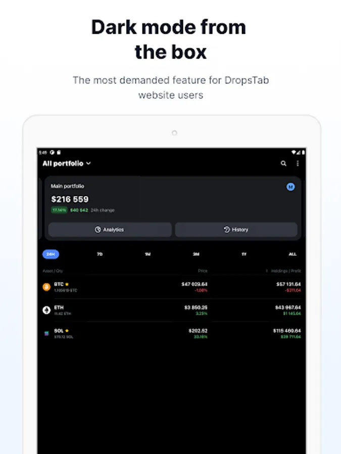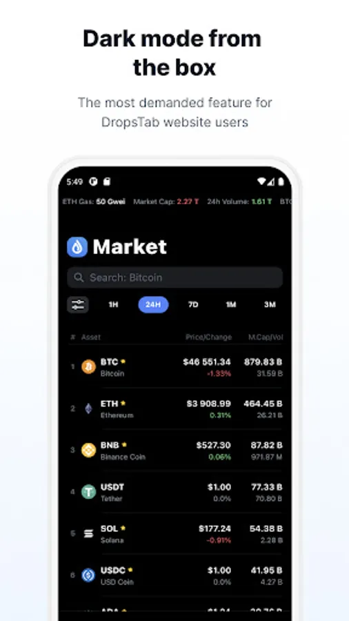 DropsTab is a cryptocurrency market tracker designed to facilitate your day-to-day crypto analytics, monitoring and portfolio management. Track prices, volumes and detailed performance of coins in your added portfolios.