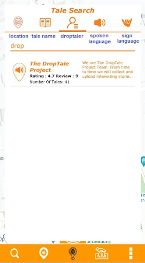 - Tales can be searched by: location, tale name, droptaler’s name, spoken language and sign language.