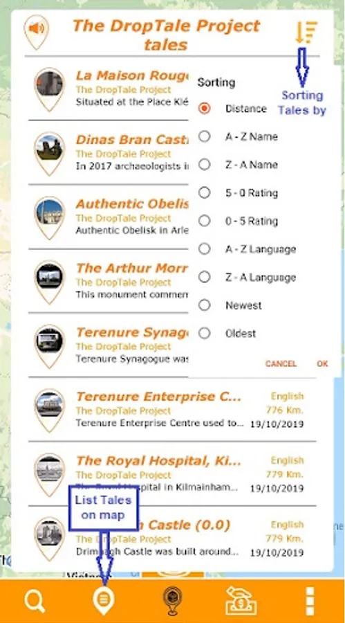 - Tales can be filtered by: distance, alphabet, rating, language and uploaded time.