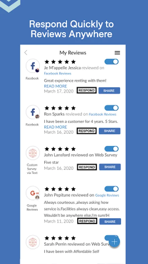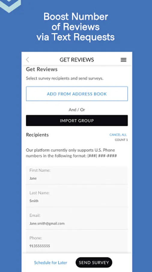 Get more customer reviews via text and email and automatically have them shared to your connected social channels.