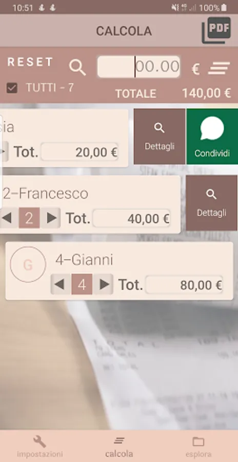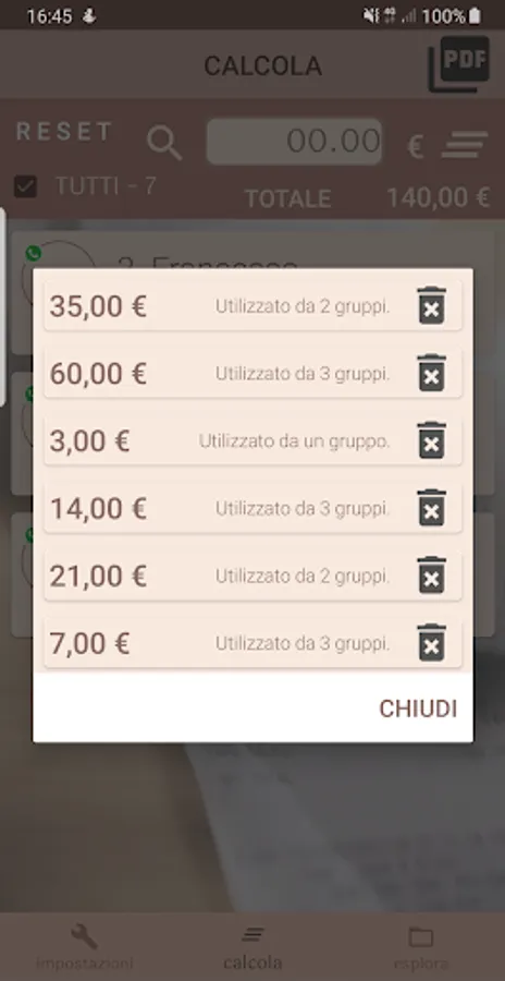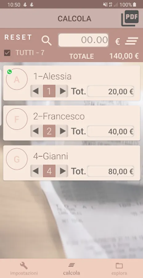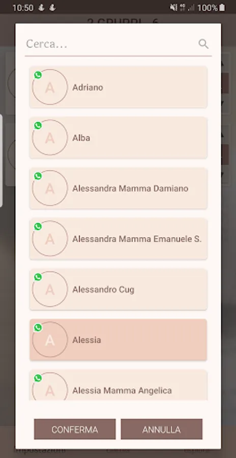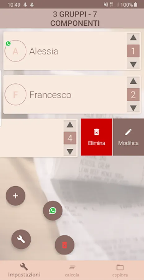 In the example of the presentation video of the app, two groups are inserted manually, Francesco who came to the dinner with his girlfriend and Gianni, who came with his wife and two children. Alessia's contact, which came by itself, is selected from the whatsapp address book.
