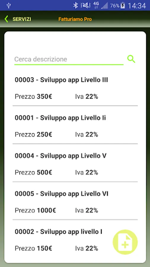 - SERVICES: As for products, please enter your services by assigning a unique code (with the possibility of being self generated), the description, the price and VAT. These last two values will be proposed by default when you are going to insert the product in an invoice, or a preventive or a receipt, but may be further modified at the time of insertion into the document in question.