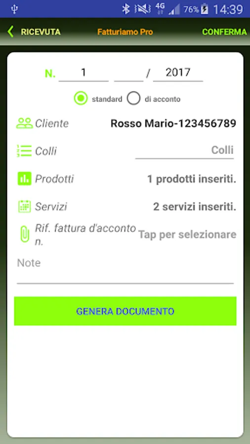 - RECEIVED: generates received by setting the customer, packages, products and services. As for the bills, it will be possible to insert receipts of payment that may be associated with a later standard receipt. **