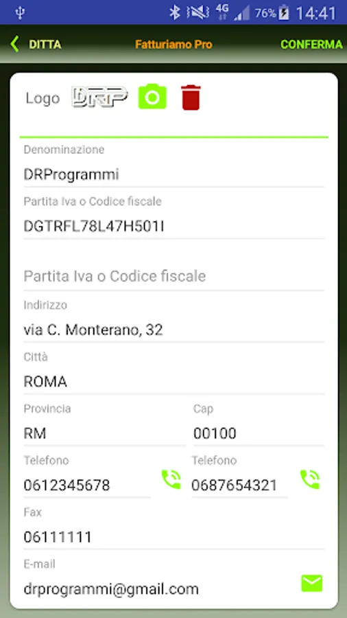 - COMPANY: enter the data of your company (logo, name, VAT number, social security number, address, city, state, zip code, telephone numbers, e-mail and notes.