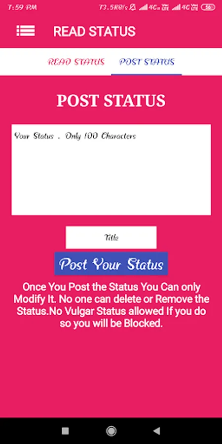 Very easy to use interface just swipe left and right to read the best status and easily set that as your WhatsApp status or FB status.