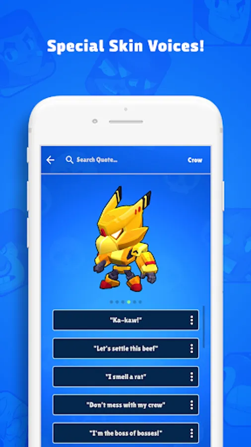Instead of searching brawlers in the game to hear what they say, you can use this app, find the voice line & brawler's skin you are looking for and have fun with your friends and family!