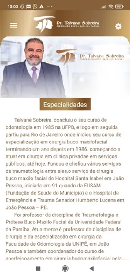 Talvane Sobreira, completed her dentistry course in 1985 at UFPB, and soon after she left for Rio de Janeiro where she started her specialization course in maxillofacial surgery, finishing a year later in 1986. Starting to work in surgery in a private clinic and in public services, even today. He founded and headed several traumatology services, among them, the buco maxillofacial surgery service at Hospital Santa Isabel in João Pessoa, started in 91 when FUSAM (Municipal Health Foundation) and the Emergency and Trauma Hospital Senador Humberto Lucena in João Person - PB.