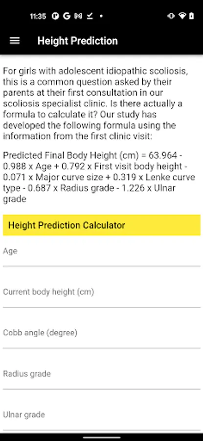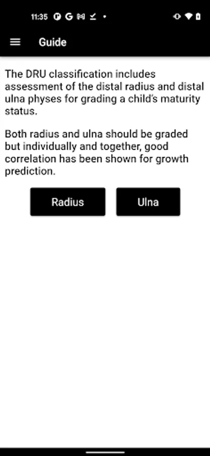 The distal radius and ulna (DRU) classification is an accurate parameter of a child’s maturity status. It is useful for management of spine and limb deformities as it can predict the peak growth spurt and growth cessation with good sensitivity and specificity. It has also been shown to be an indicator of scoliosis curve progression and predict which curves will deteriorate. This app provides users with a tool to understand the DRU classification, how to use the classification for grading skeletal maturity, and also for guiding treatment. In addition, this app has a calculation function for final body height prediction for female patients with idiopathic scoliosis.