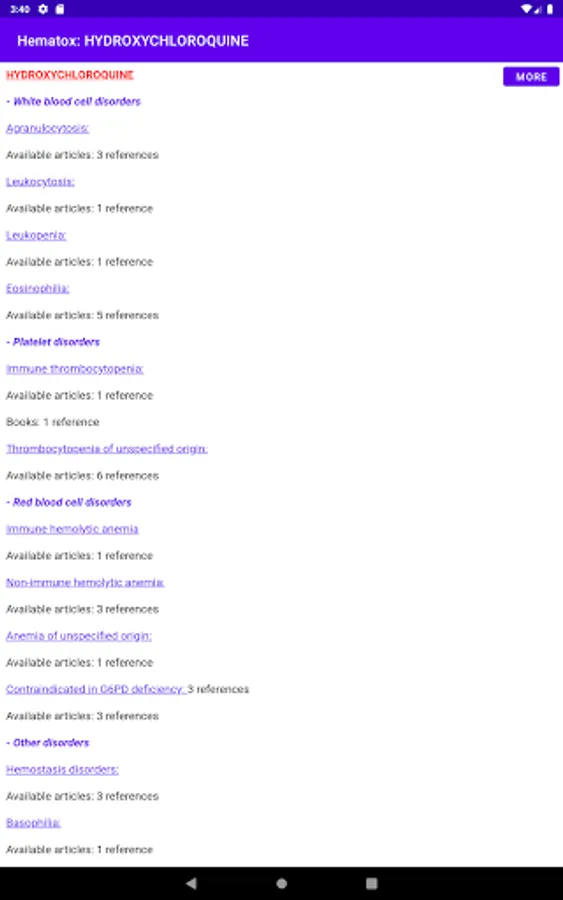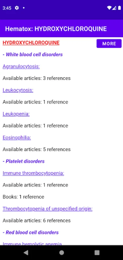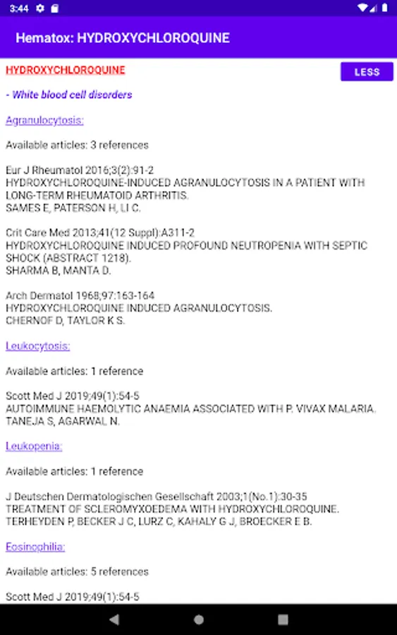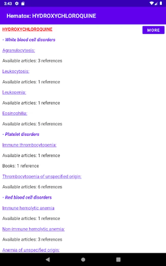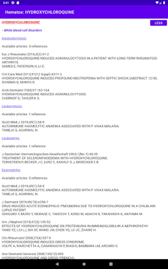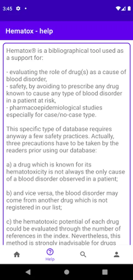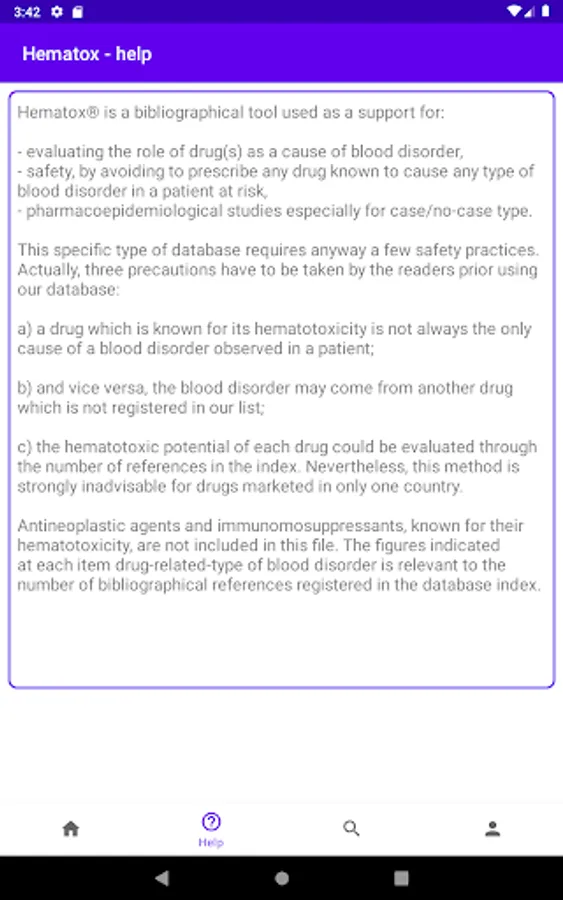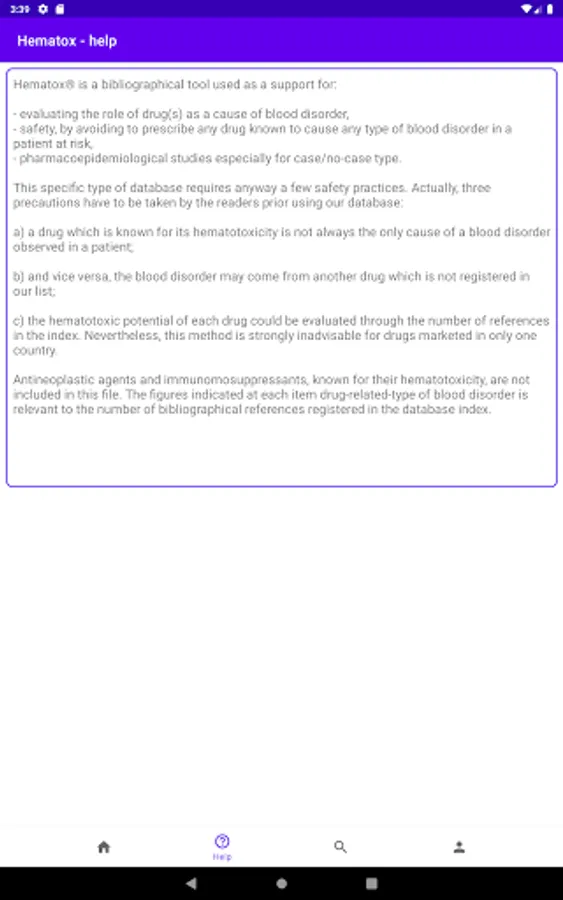 Hematox®, a bibliographical databank based on drug-induced blood disorders, was created in 1983 by Michel BIOUR (MD, PhD), and monthly updated in accordance with other bibliographical databases to the analysis of the references cited in the articles. All the published cases for selection and classification were re-evaluated in accordance with criterions usually validated in hematology. 1137 drugs are registered with 17978 corresponding and available references. Anticancer drugs and immunomodulators, well known for their intrinsic hematotoxicity, are not indexed in Hematox.