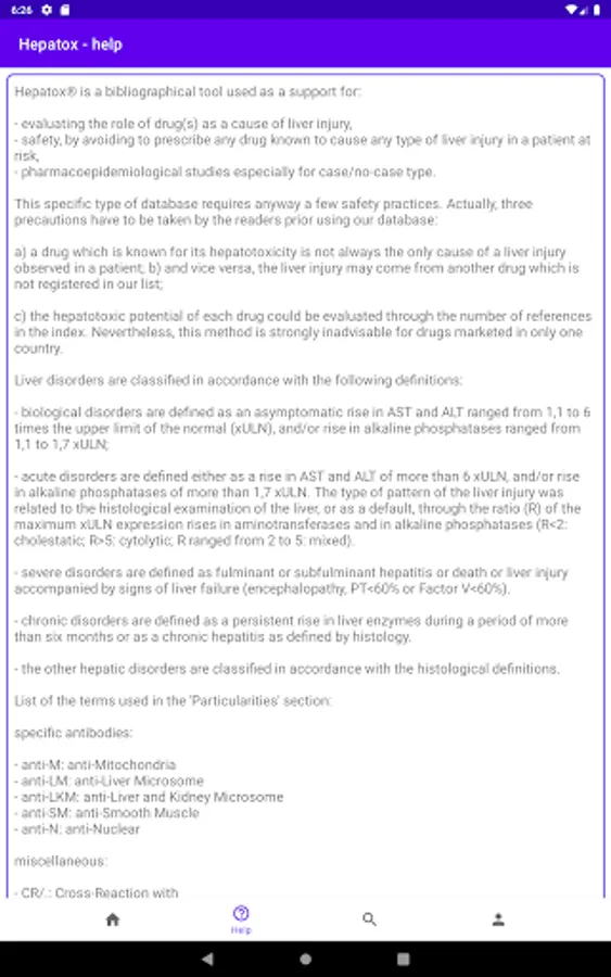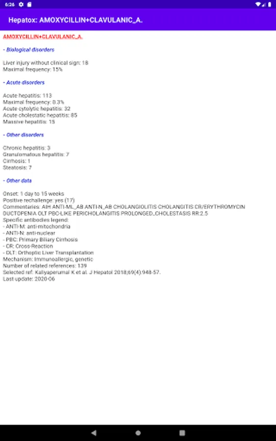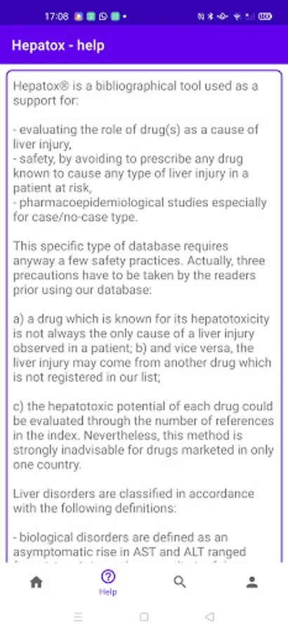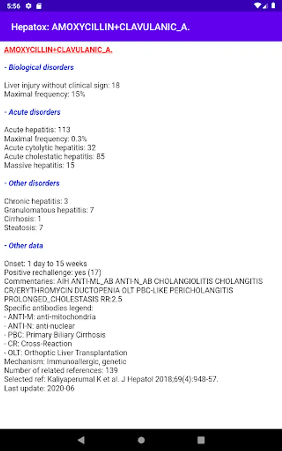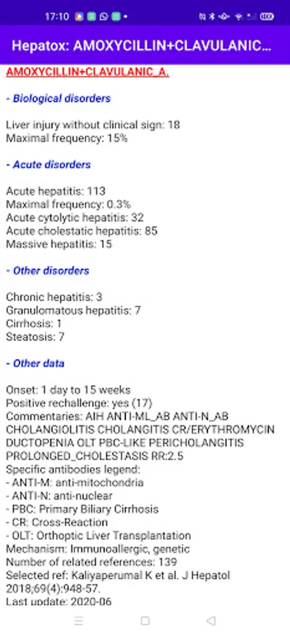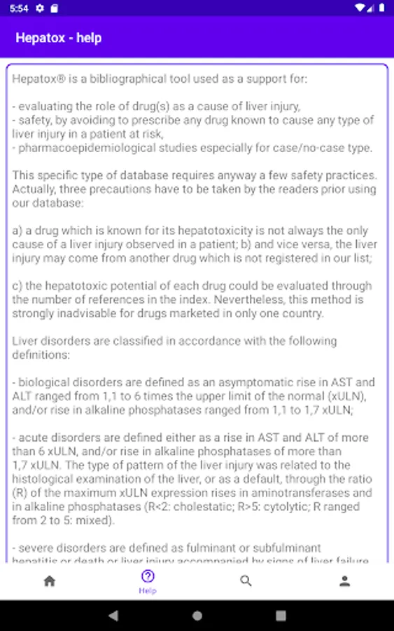 Hepatox®, a bibliographical database which reviews drug-induced liver injury, was created in 1980 by Michel BIOUR (MD, PhD), and has been monthly updated in accordance with other usual bibliographical databases to the analysis of the references cited in the articles. All the published cases for selection and classification were re-evaluated in accordance with criterions usually validated in hepatology. 1479 drugs are registered with 19,691 corresponding references. We provide the number of references for each type of liver disorder and one selected reference for each drug.