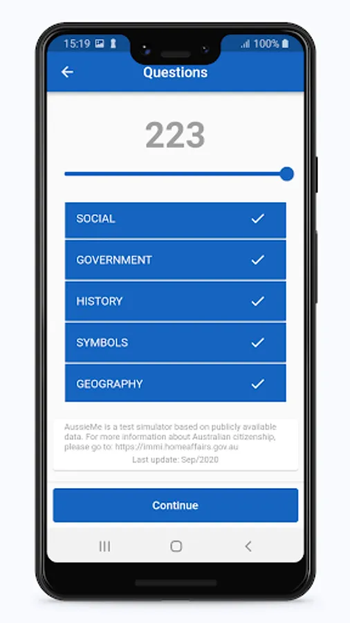 AussieMe will help you! It provides a list of questions and answers based on publicly available data about Australian history and customs. It also provides results statistics to improve your test performance.