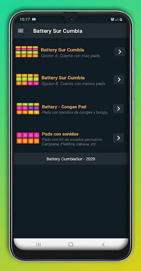 BatterySur Cumbia is a free application that simulates the Electronic Battery musical instrument on smartphones.