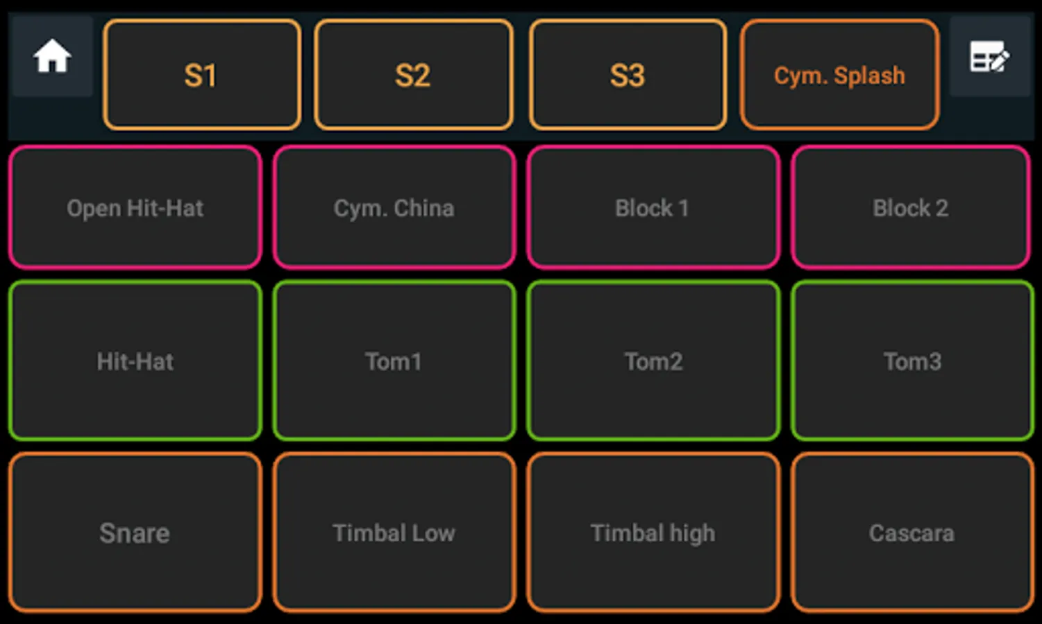 - Toms, Hit-Hat, Kick, Block, bell.