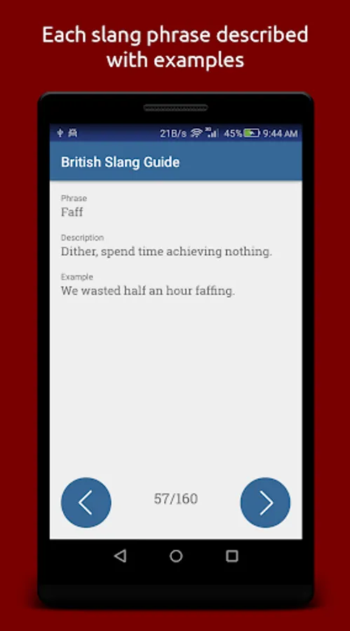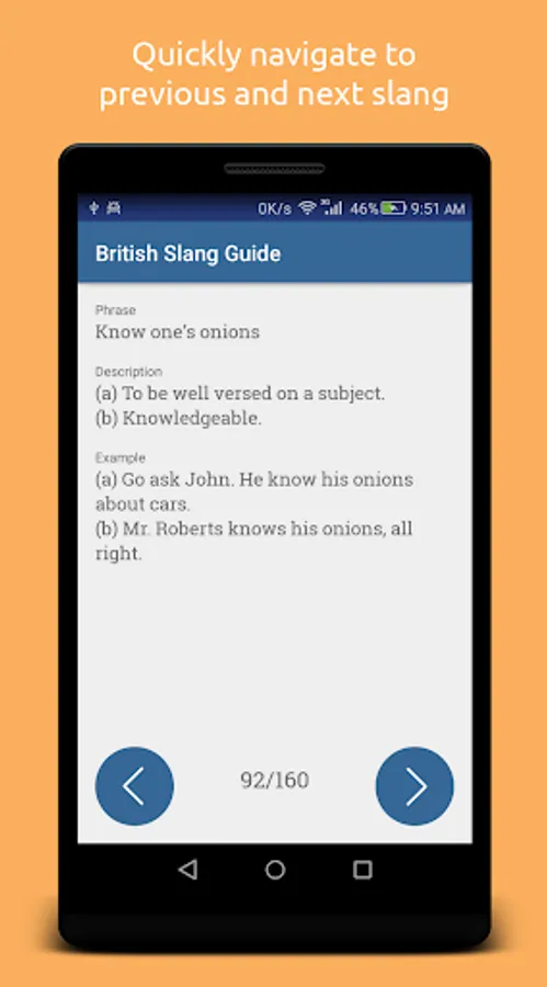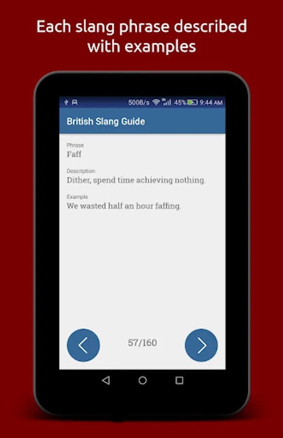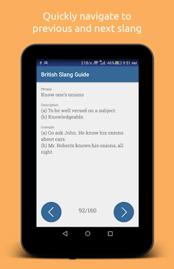 Learn most common British slang used in common spoken language, quickly and easily. British Slang Guide is especially recommended for non-native speakers of English language and immigrants.