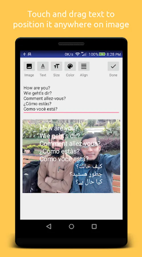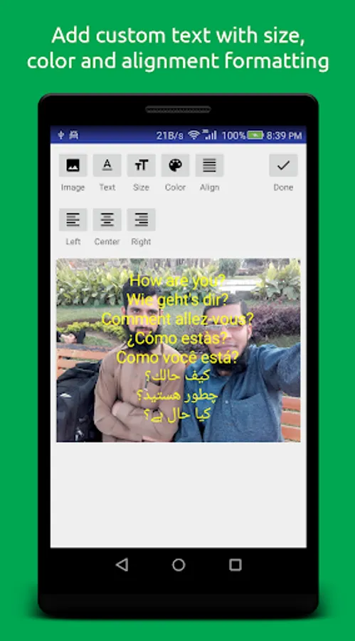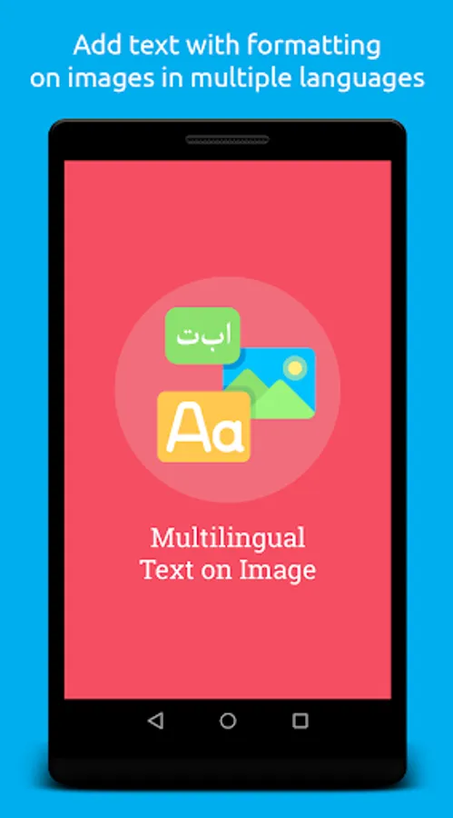 The free Multilingual Text on Image app allows you to add formatted text on photos. It also allows you to customize text using size, color and alignment. The app allows you to write in multiple languages at once. You can save your customized photos as well as share them with your friends on social networks and instant messaging applications. Unlike other similar apps, the app does not imprint any watermark on the photo.
