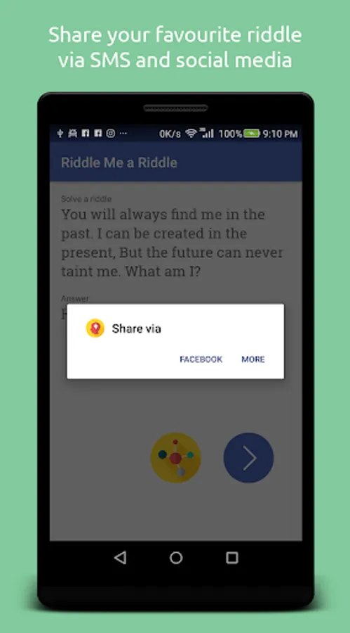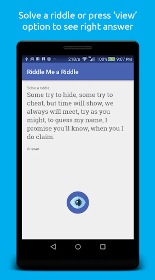 The free Riddle Me a Riddle app is based on solving, explaining and interpreting riddles. The app is made as a great pastime for fun and pleasure. The app sharpens your mind and increases IQ level. Enjoy your time with friends and share riddles on social media.