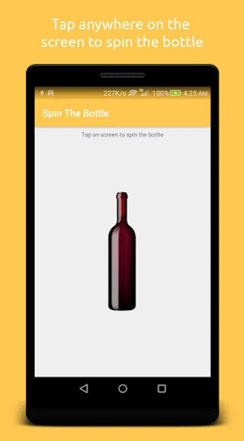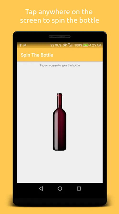 Spinning the bottle works by tapping anywhere on the app screen. Each time bottle spins, it spins for different duration of time and always stops at a randomly selected direction. To make the app foolproof, we have configured the spin functionality to always spin in opposite direction, i.e. first spin clockwise, second spin anti-clockwise, third spin clockwise, and so on.