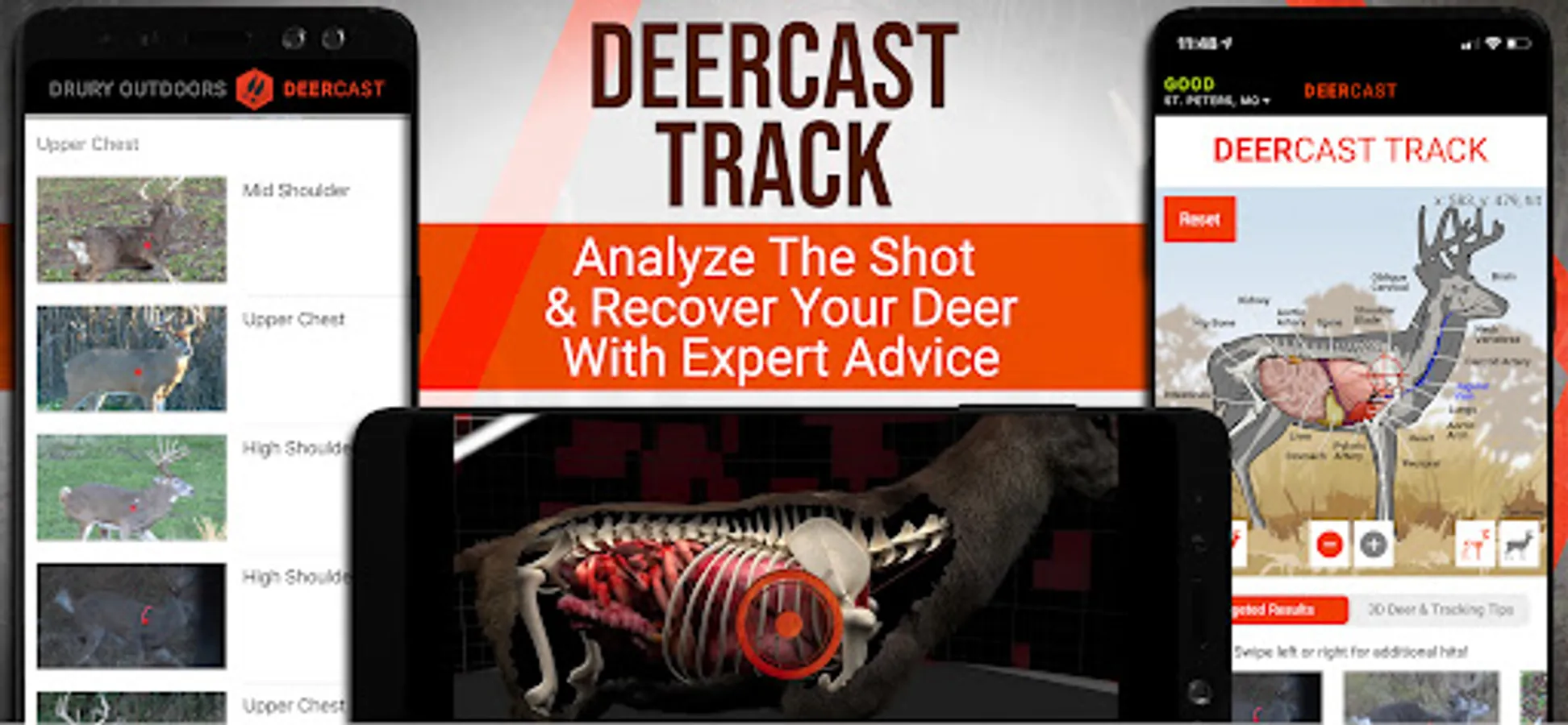 Select your hit on an anatomical whitetail model then get expert advice to track and recover your deer!