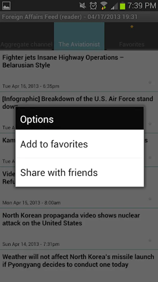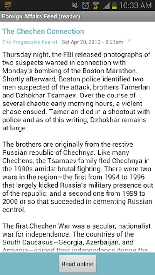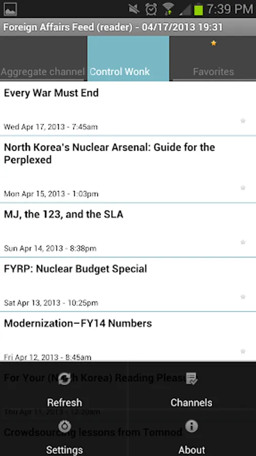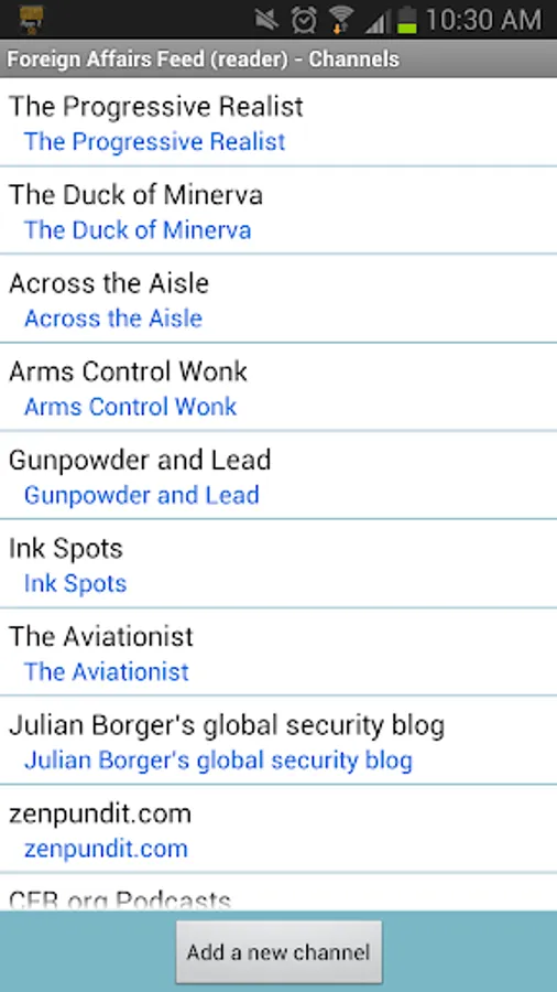 This app allows you to follow prominent voices in foreign affairs as well as related news and current affairs categories via RSS, while adding your own as well. Enable/Disable feeds from the Aggregate Tab by long-pressing a feed from the Channels option. It is based on the open source app, FeedGoal. Several new feeds have been added; if you installed the app a while ago, clear the cache or uninstall and reinstall for these new feeds to work. Last updated 7/15/2014