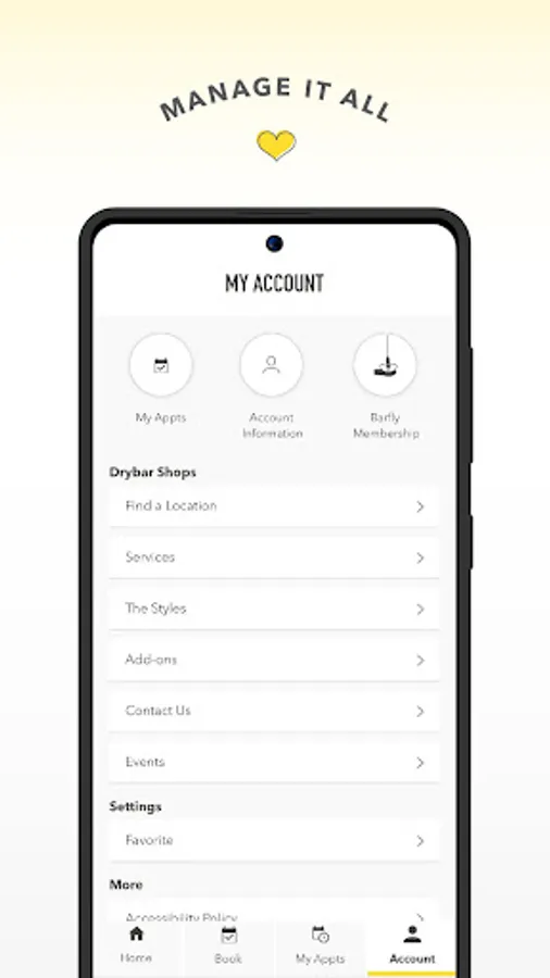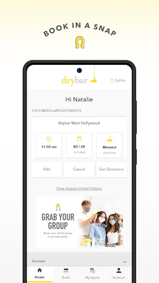 Easily book a blowout appointment for you and all your friends. View, edit, or cancel your upcoming appointments on your personal home screen and seamlessly rebook your favorite service & location with just a few taps. You can find a Drybar location while on the go and become a Barfly with our Signature or Premium Memberships to ensure your hair is perfect on your most important dates throughout the month.