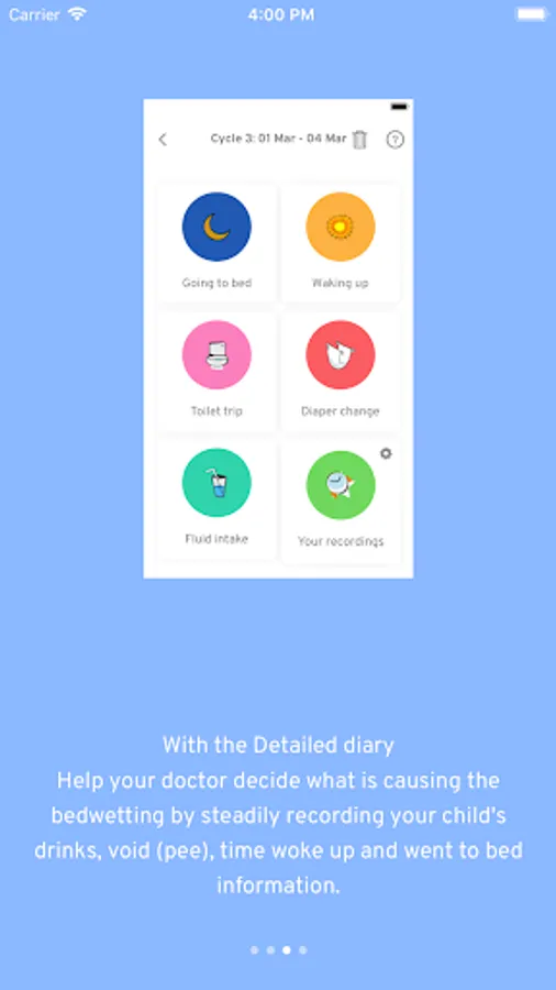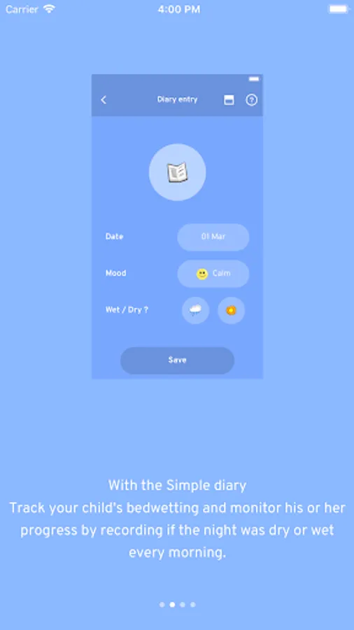 The Drydawn app is aimed at parents and their children who wet their bed, and provides the following features: