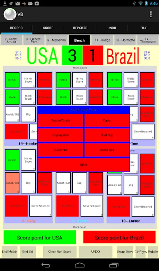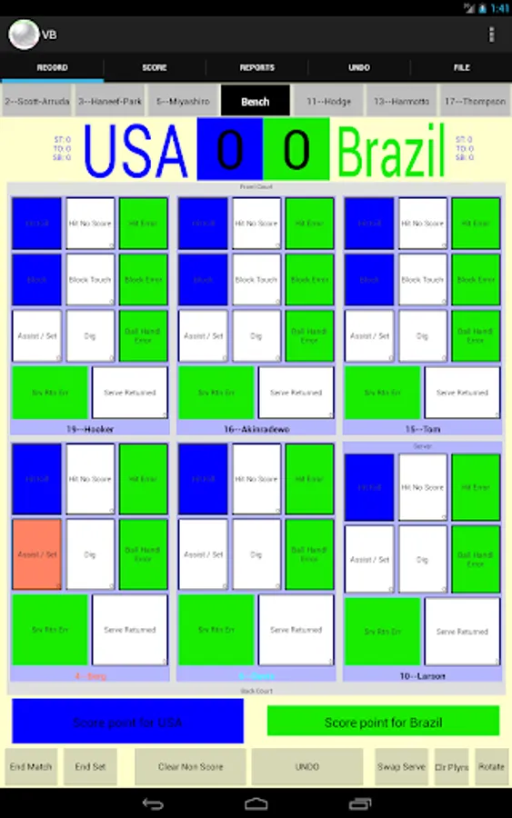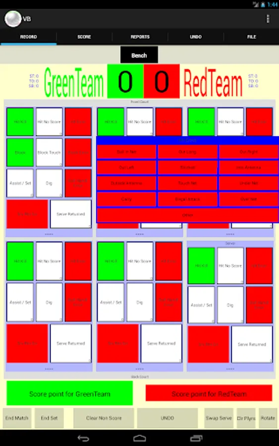The interface is extensively customizable; colors, players and buttons can all be easily changed. Hence the app can be as easily used for 2 person beach as for 6 person indoor or even 9 (or more) person games. Every stat recording button can be defined to appear or not. Also, every detail button can be configured to be recordable with a single button click. Taking this ability to the illogical extreme, each playing position can be configured to have over 100 buttons. At the other extreme, playing positions can be configured to have no buttons at all.