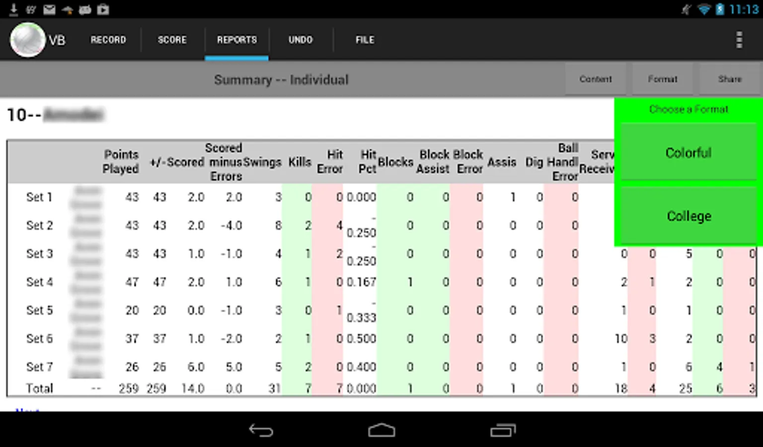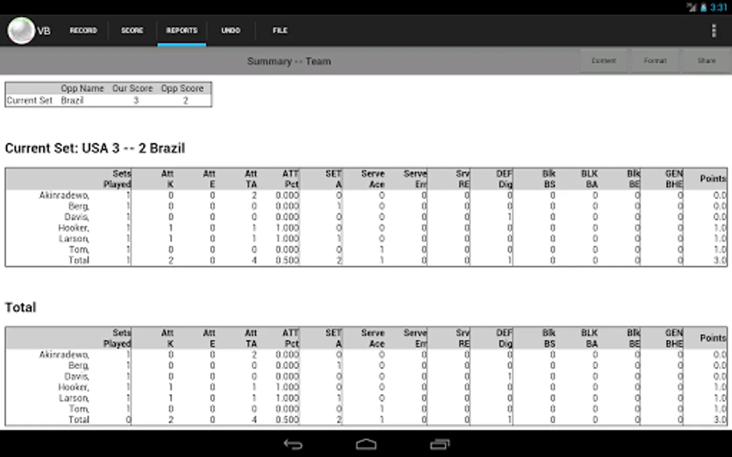 Volleyball Stat! is a full-featured app for collecting and distributing volleyball statistics on your tablet. The app can collect stats for an unlimited number of matches for an unlimited number of different teams each of which may have an unlimited number of players. It can also be used simply for score keeping and as a scoreboard.