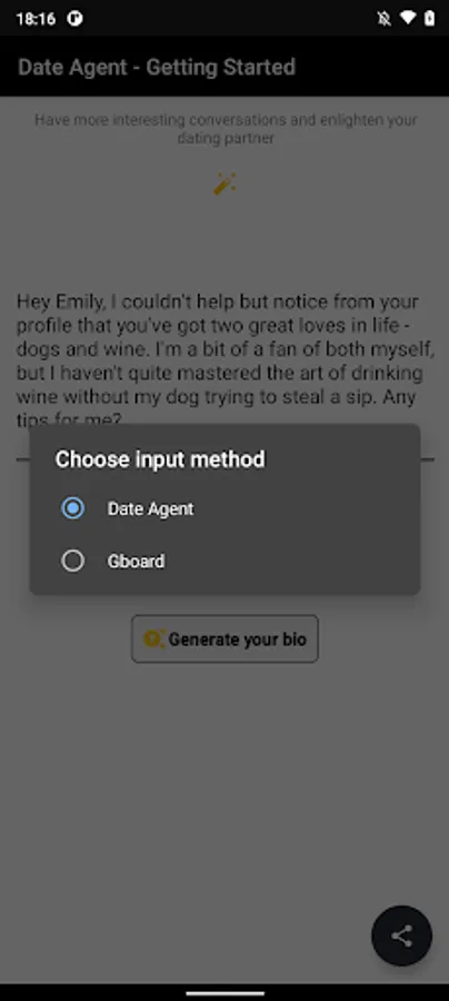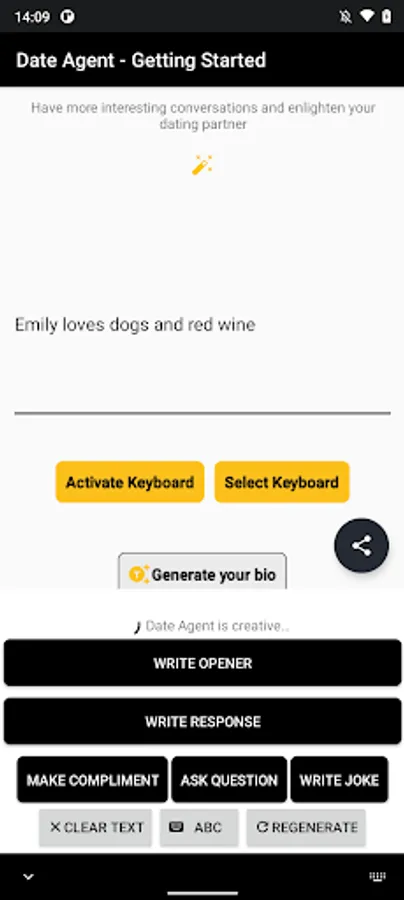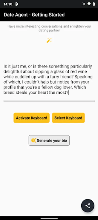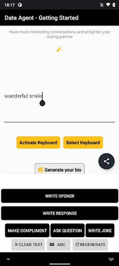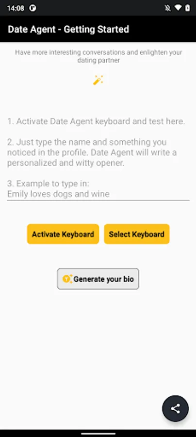You have ideas and keywords in mind, and are just not able to put them in well-written and eloquent sentences? We help you - enable the Date Agent Keyboard and use it in any preferred app, like a dating app or messenger and your conversations will be better ♥️