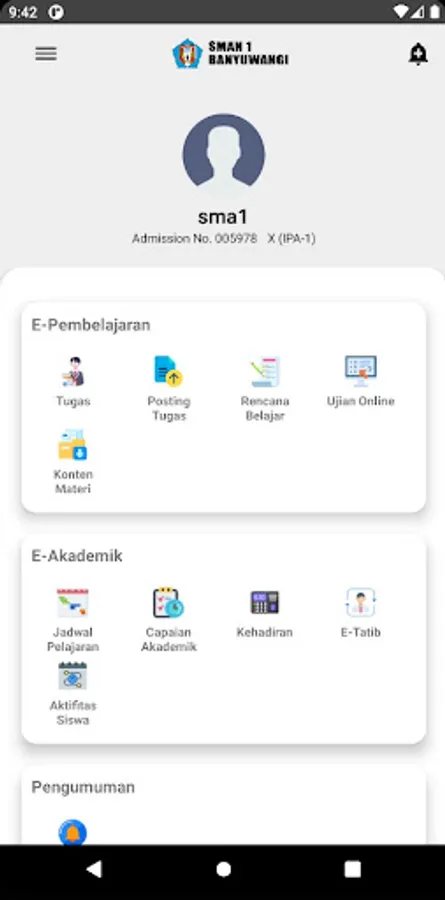 The digital school application for SMAN 1 BANYUWANGI includes various features such as announcements, lesson scheduling, sending assignments, communication between teachers, students and parents, as well as accessing learning materials online