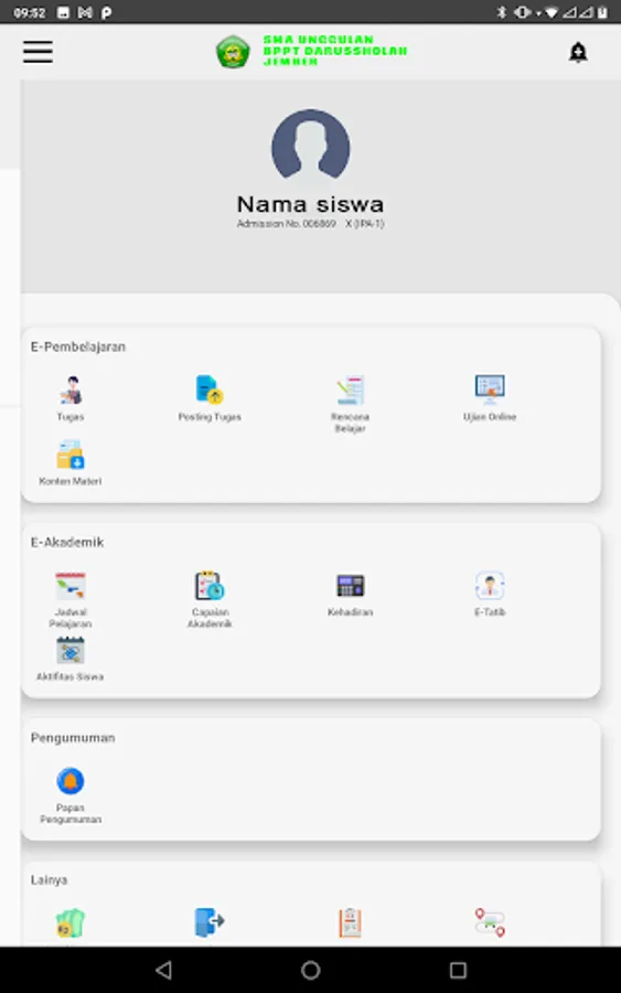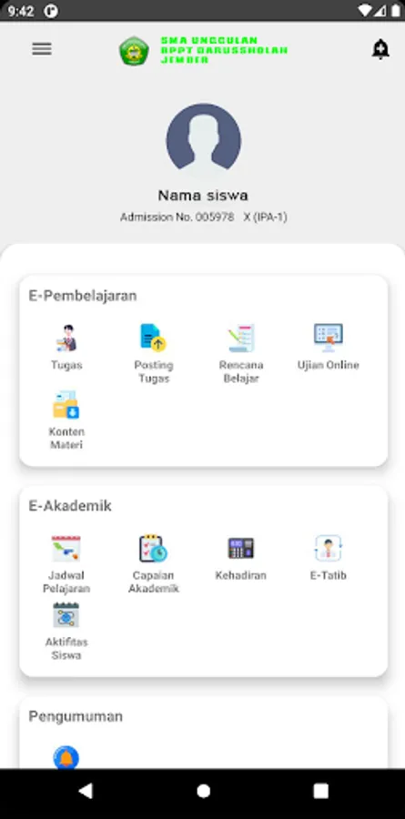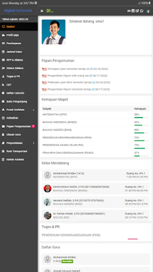 The digital application for SMA UNGGULAN BPPT DARUS SHOLAH includes various features such as announcements, lesson scheduling, sending assignments, communication between teachers, students and parents, as well as accessing learning materials online