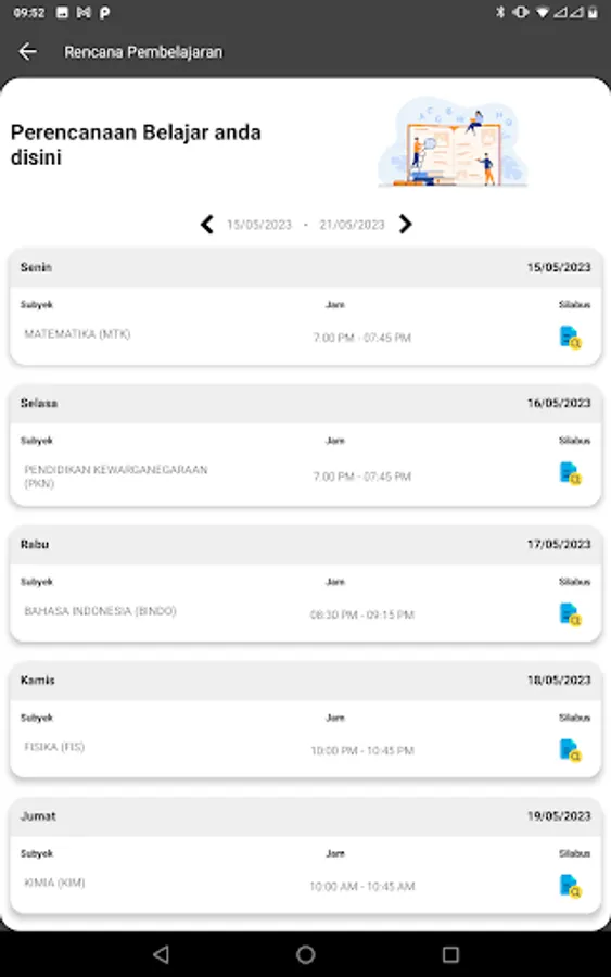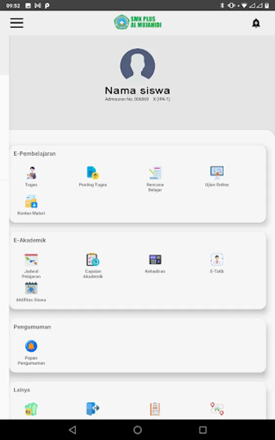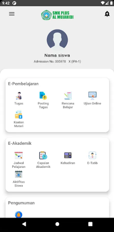 The digital school application of SMK PLUS AL MUJAHIDI includes various features such as announcements, scheduling of lessons, sending of assignments, communication between teachers, students and parents, as well as accessing learning materials online
