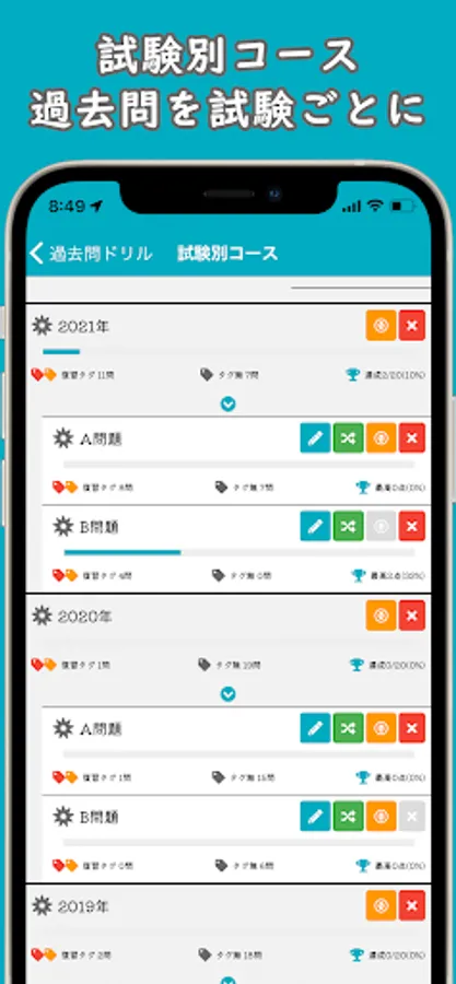 ・ "Exam-specific course" is a course to practice past questions by exam. You can solve the questions given in each exam.