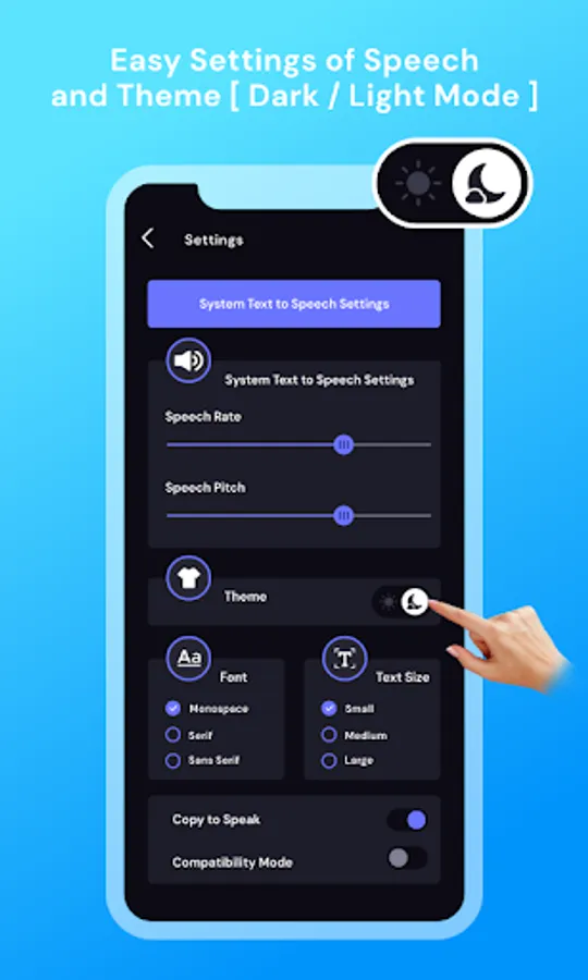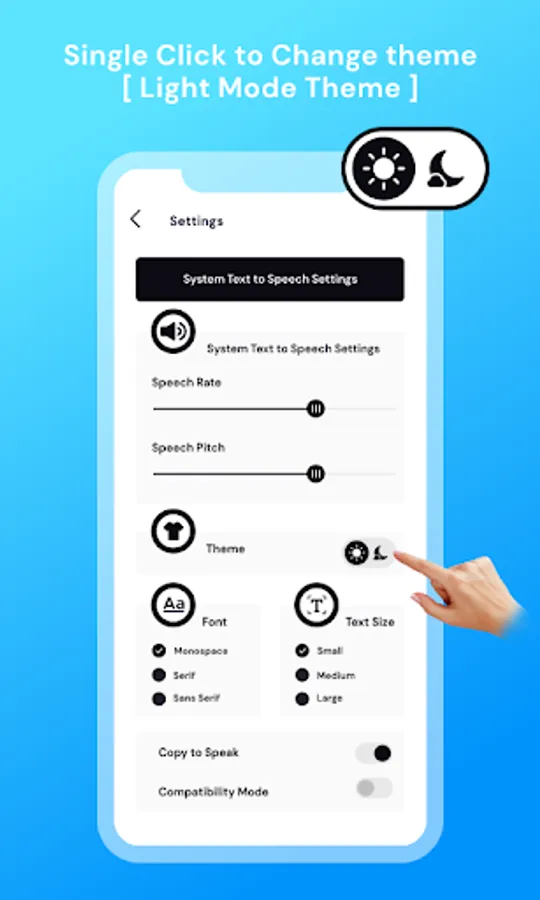 -Copy to speak like copy the text from apps or and other websites, then tap on compatibility mode the content will shown on floating speak button.