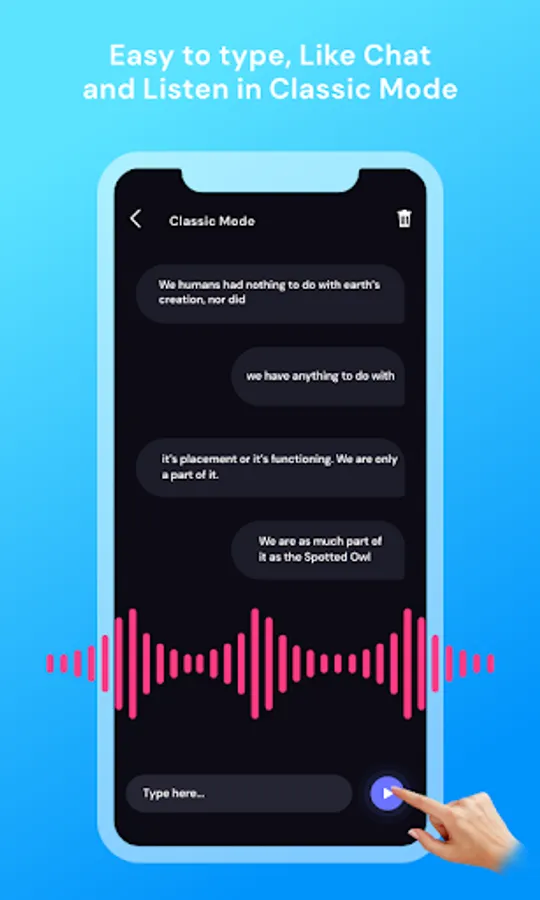 -Classic Mode for if we have some thoughts then we can write and send it will always store in app and whenever you tap the chat it read aloud it.