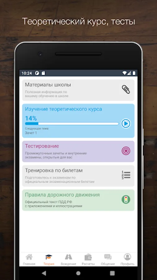 Opportunities for the cadet: schedule and registration for driving and theoretical classes, online training (if provided by a driving school), training on current tickets and traffic rules, recording the time and number of driving lessons, class history, routes, receiving notifications, chats with a driving school, information about the driving school.