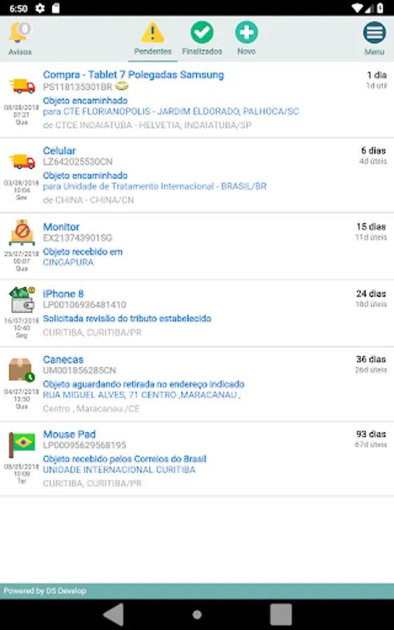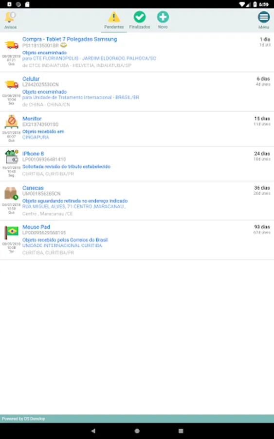 With the Rastreio Fácil app, you can track all your orders registered at Correios, and Plimor, Patrus, Sequoia/Texlog (Free Market), and SSW system carriers.
