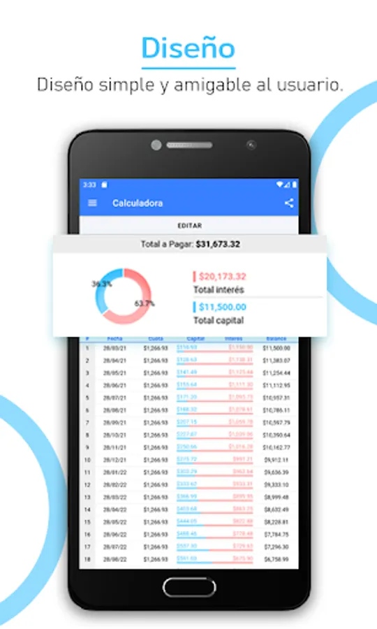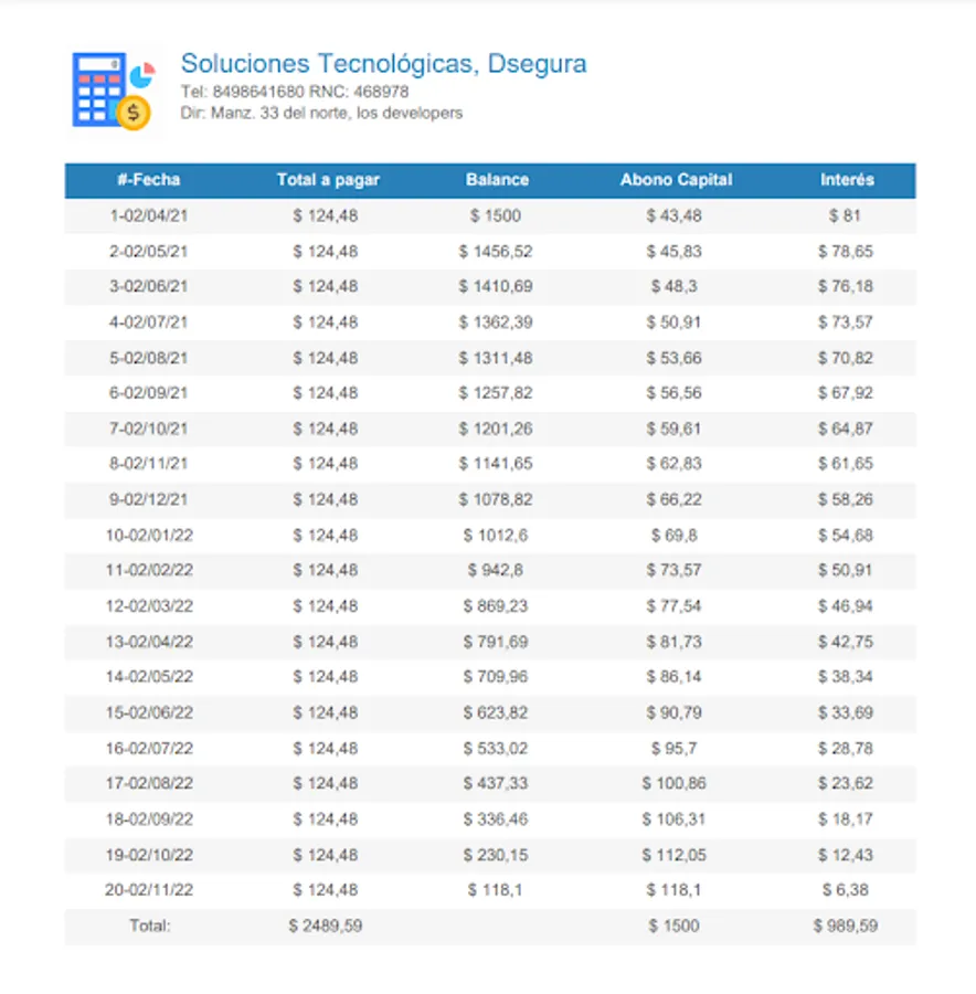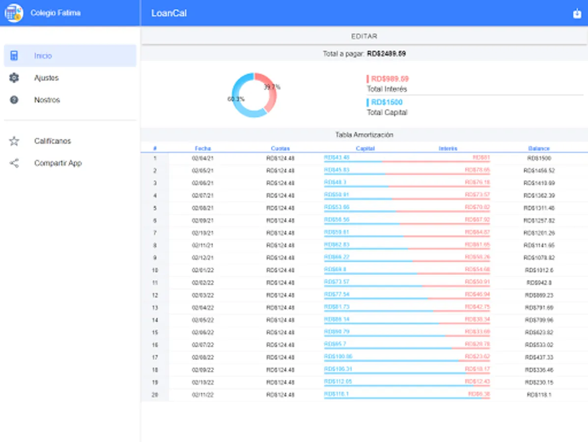 This application allows you to calculate the payments of your loans so that you can have a calculation before requesting them. Easy to use, with a simplified interface so you don't have to worry when calculating your personal loans.