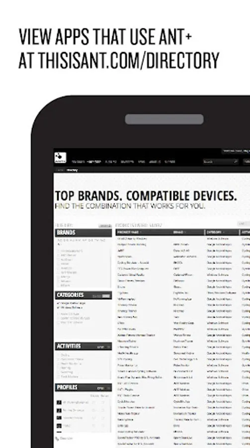 For a full list of compatible ANT+ apps and devices visit https://www.thisisant.com/directory/