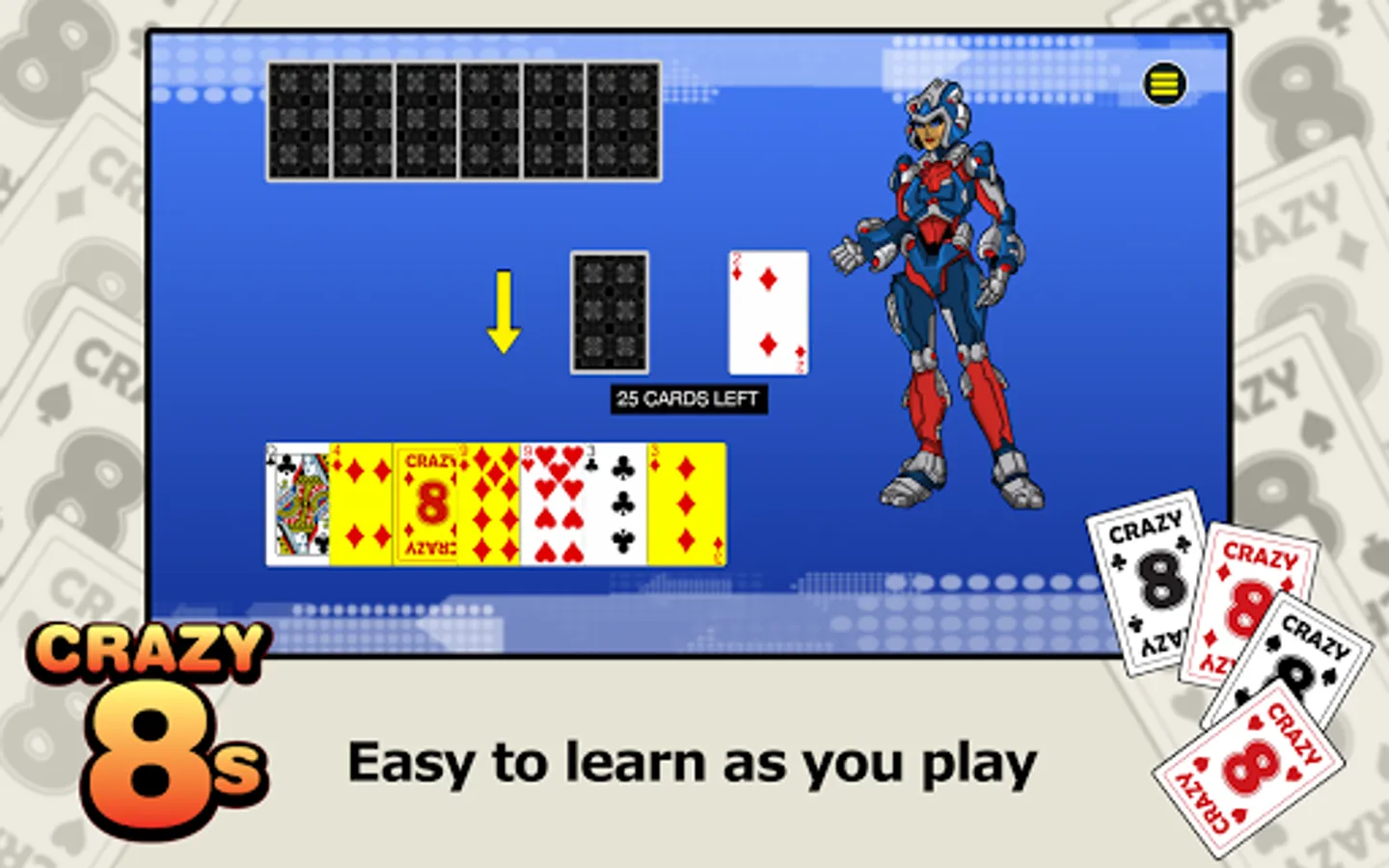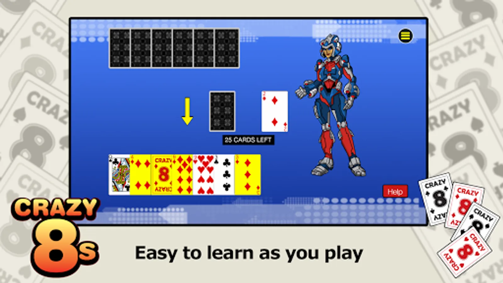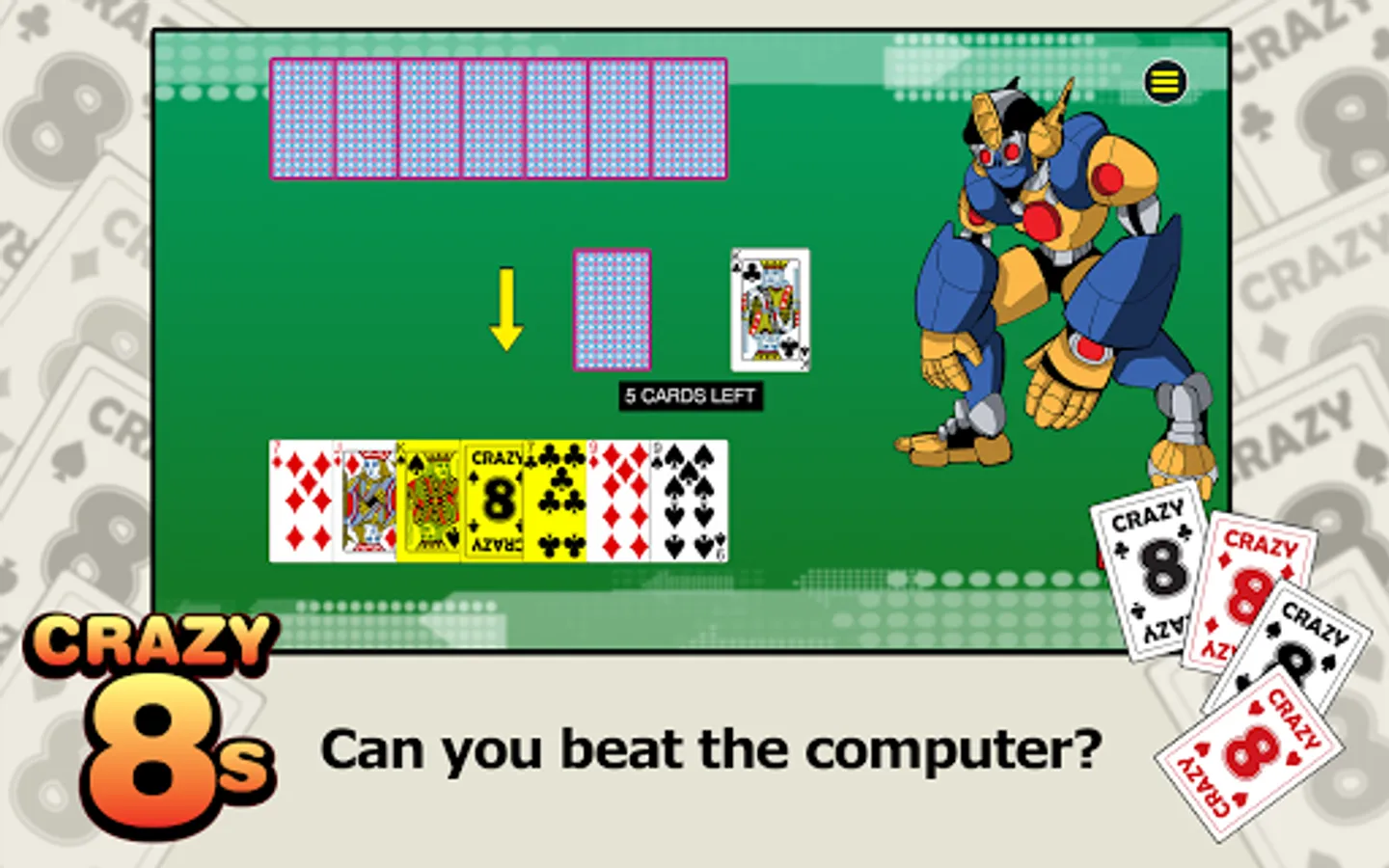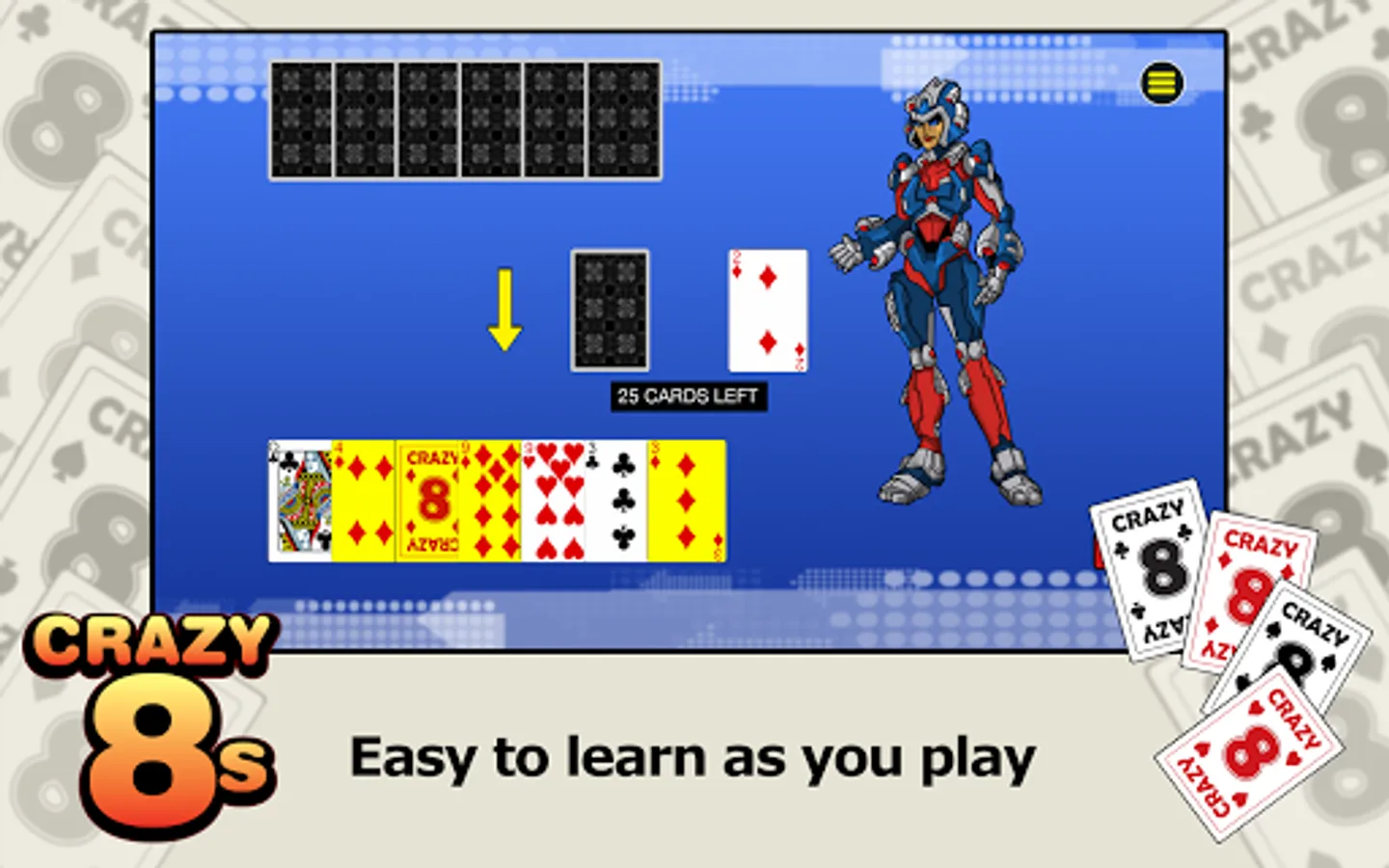 This is a one-player version of the classic Crazy Eights card game for all ages, where you play against the computer. This version of Crazy Eights is easy to learn as you play. Although there are different and complex variations of Crazy Eights, this app uses the simple rule of a limit of one play of a card per turn. Help is provided during the game if you need it.