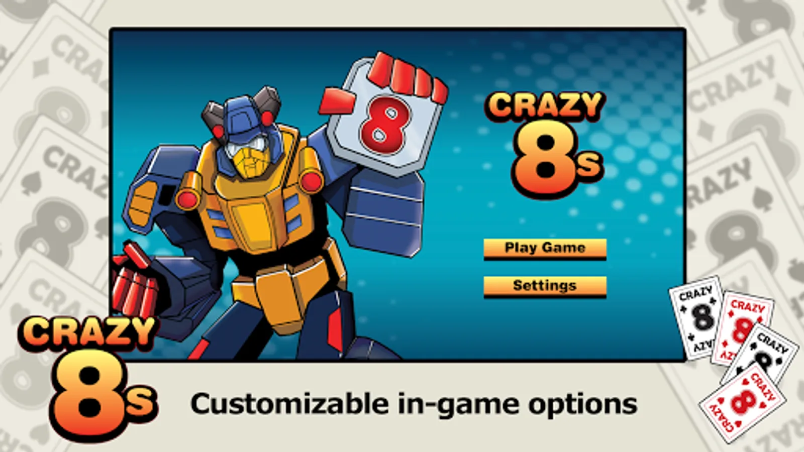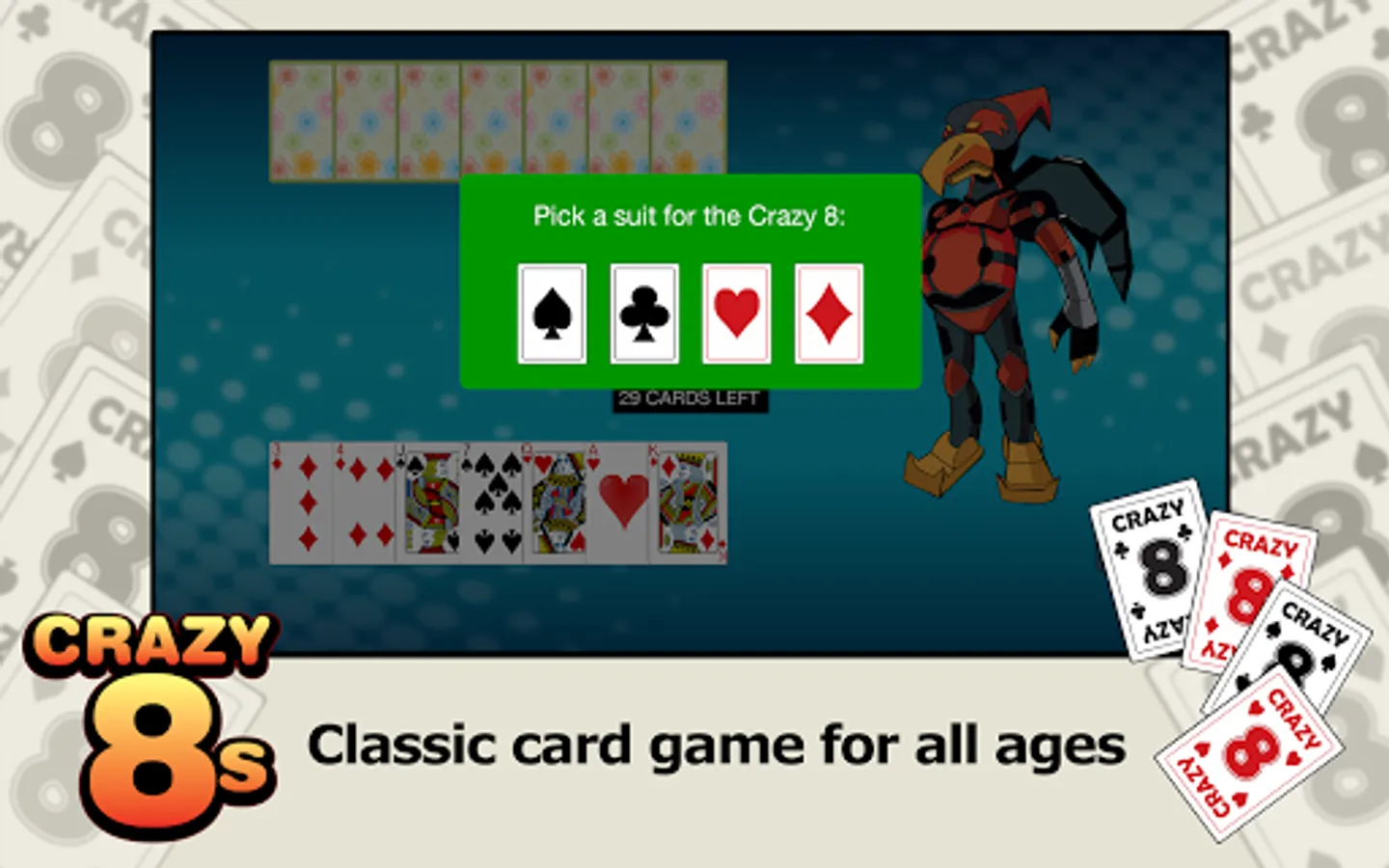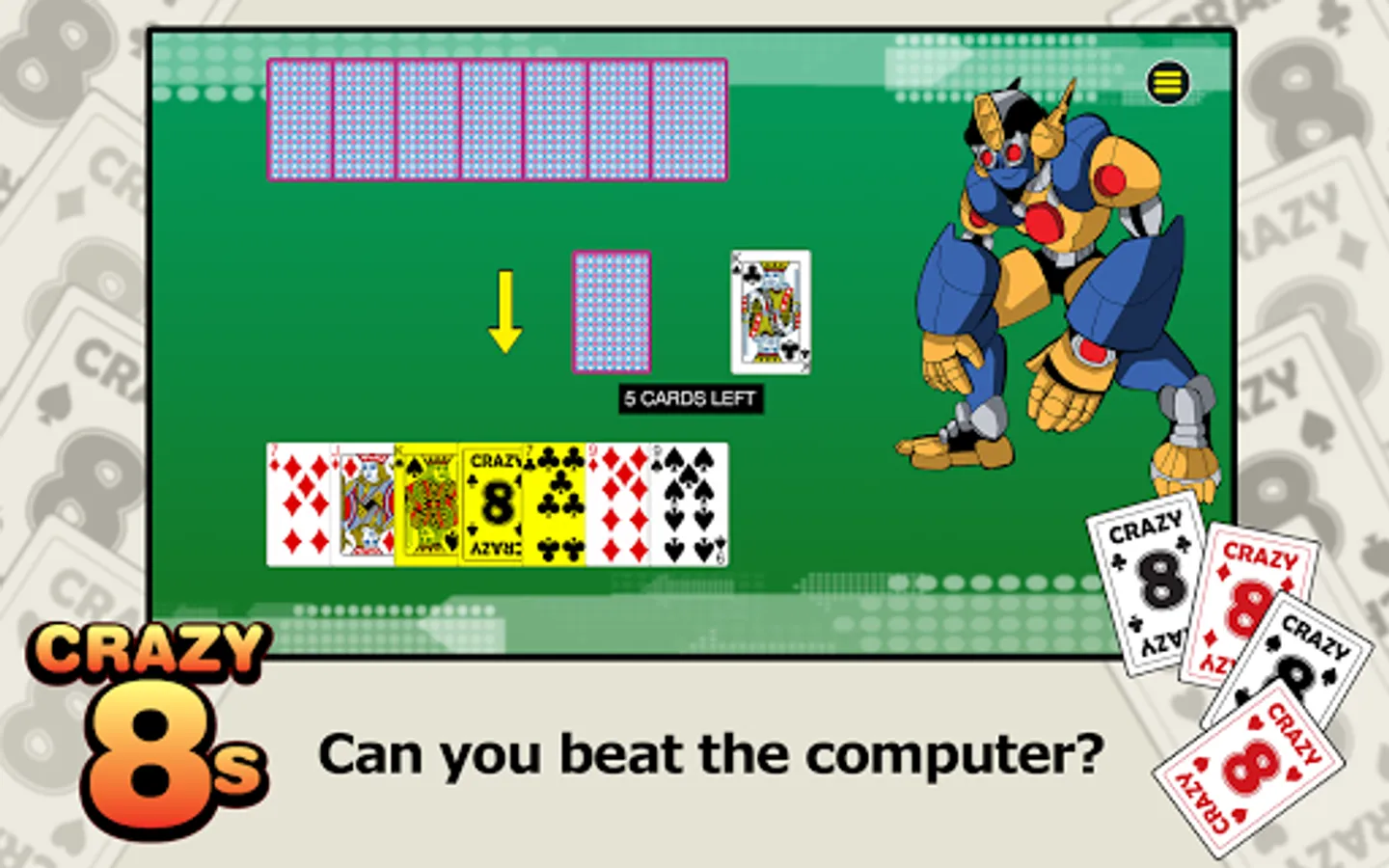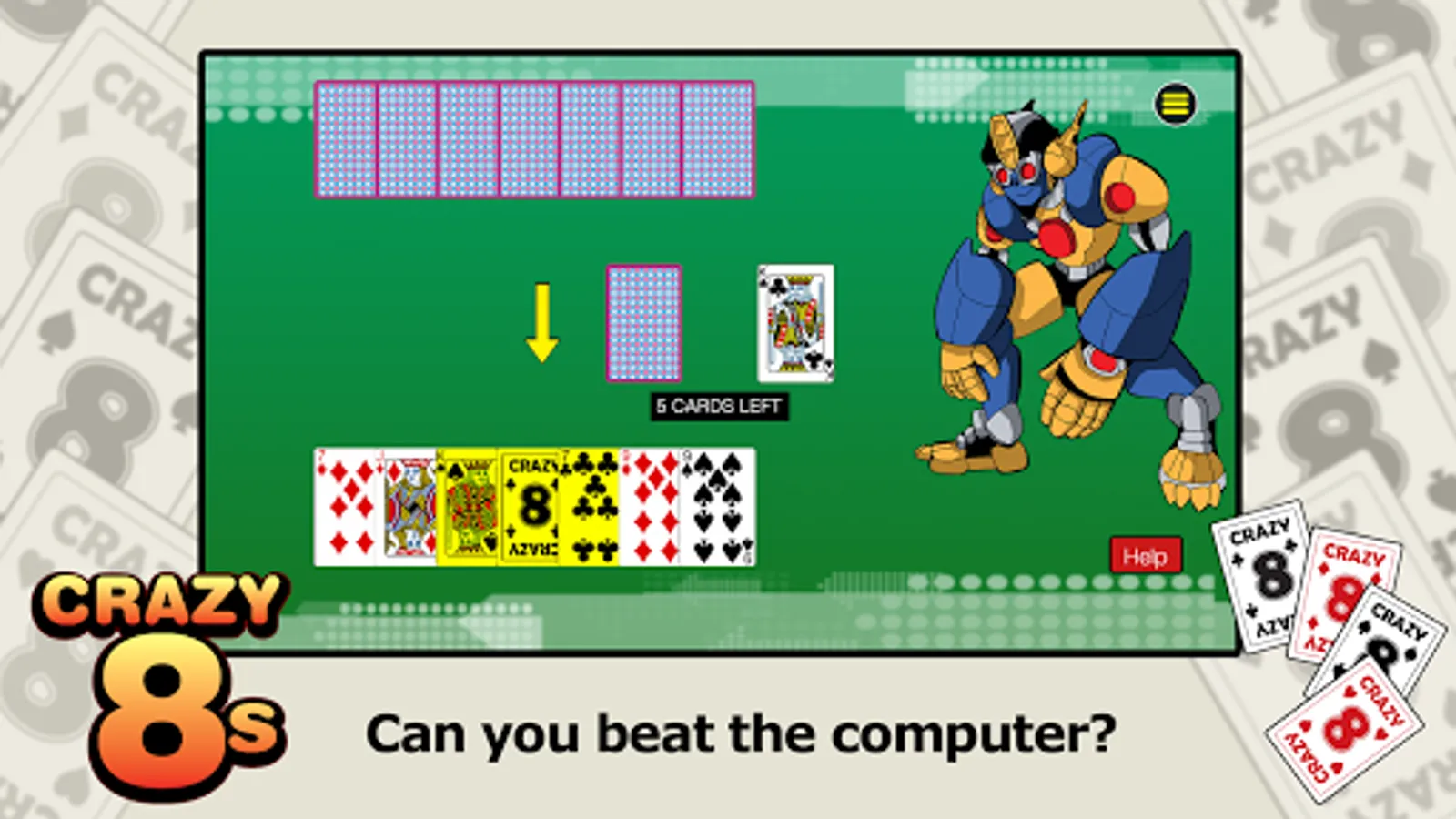 This is a one-player version of the classic Crazy Eights card game for all ages, where you play against the computer. This version of Crazy Eights is easy to learn as you play. Although there are different and complex variations of Crazy Eights, this app uses the simple rule of a limit of one play of a card per turn. Help is provided during the game if you need it.