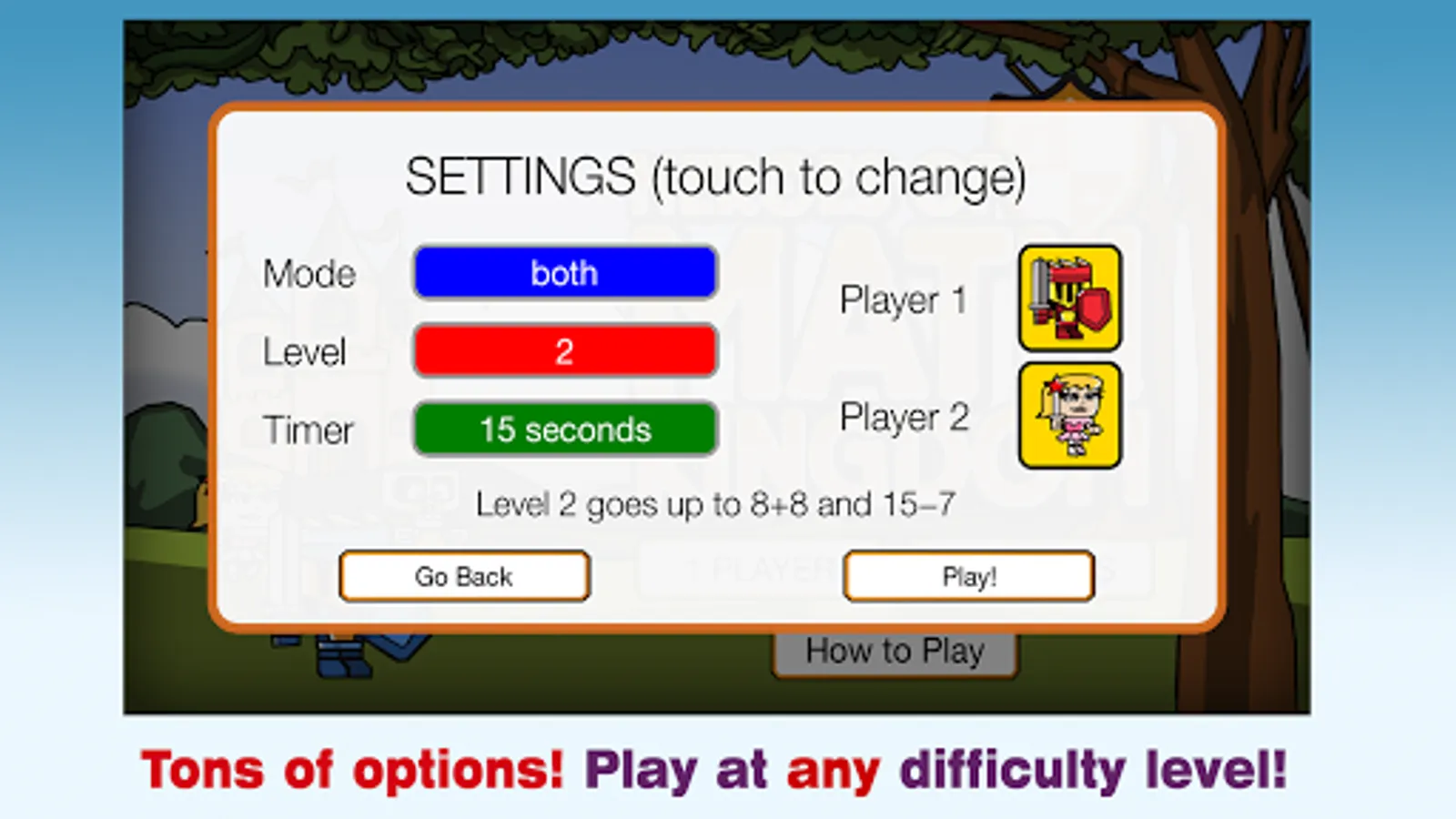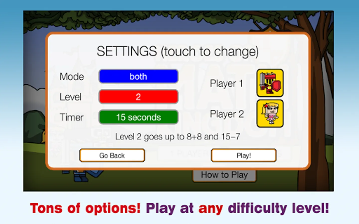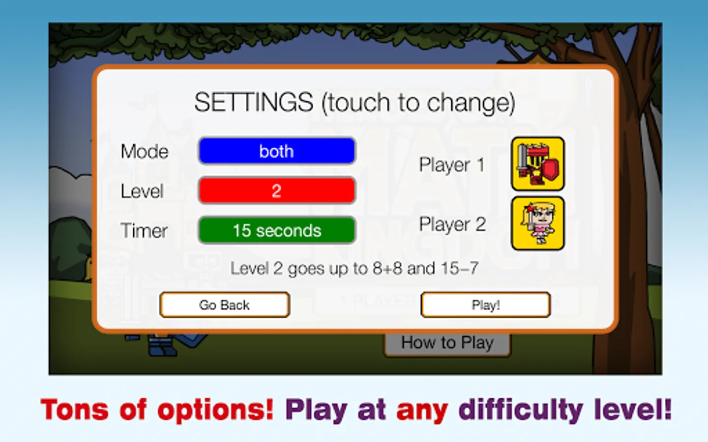 - The option to play at specific difficulty levels of addition and subtraction, from beginner math learners to young experts!